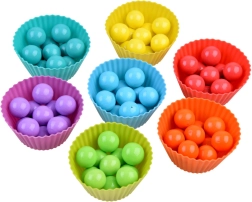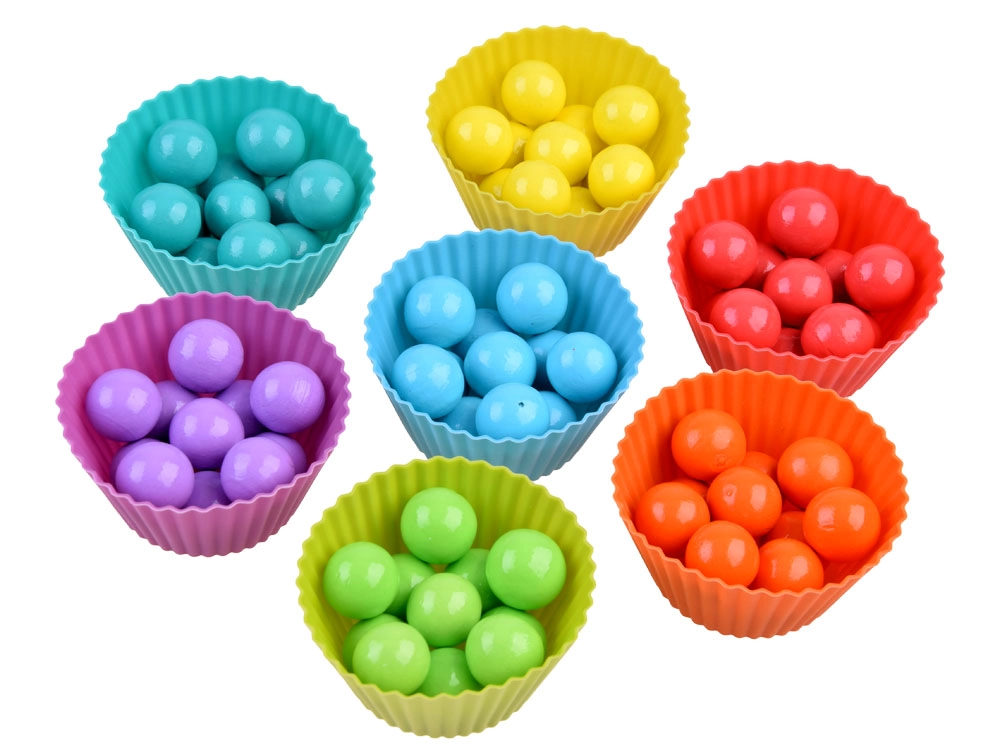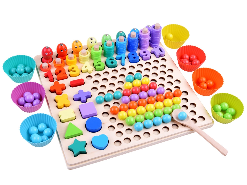 Con bolitas, anillos y vasitos, los niños aprenden los colores, las cantidades y las bases de la aritmética. Ideal para el aprendizaje visual y el conteo lúdico hasta 10.