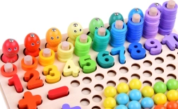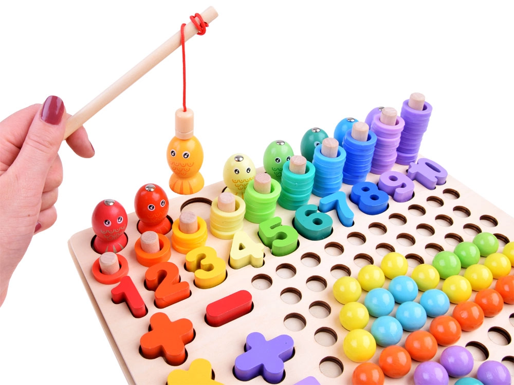 Descubre una forma divertida de enseñar a los niños los números, el conteo y los colores con este juego educativo de madera lleno de actividades. Gracias a la pesca magnética, el clasificado de bolitas de colores, el encaje de formas y el conteo hasta 10, desarrolla la motricidad fina, el pensamiento lógico y las habilidades de coordinación de forma lúdica.