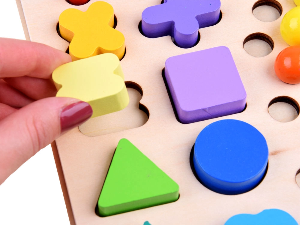 La base de madera con formas, números y símbolos enseña a realizar la asignación correcta, a reconocer formas y fomenta el pensamiento lógico durante el montaje.