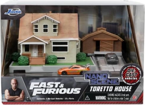 Incluye dos coches legendarios: Dodge Charger y Toyota Supra, en acabado metálico con rodadura libre, ruedas giratorias y neumáticos de goma para un aspecto realista. La diorama se completa con una barbacoa de jardín y mobiliario que recrean la escena conocida de las películas.