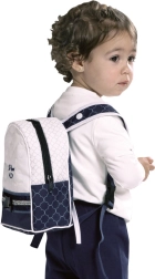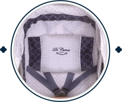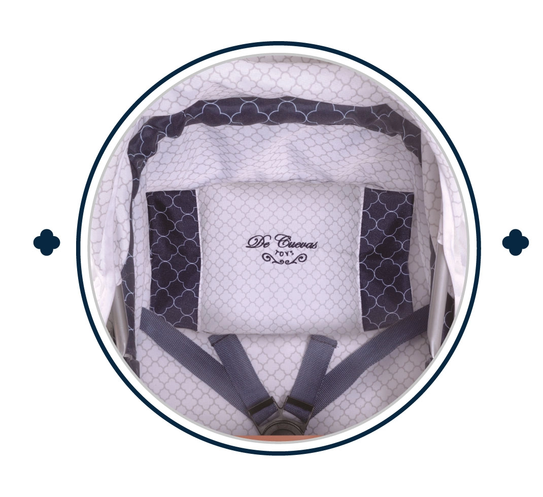El cochecito destaca por su elegante diseño español con detalles acolchados e imitación de madera en las empuñaduras. No faltan el arnés de seguridad de tres puntos, el suave acolchado y la amplia cesta para lo imprescindible. También incluye una mochila con estilo que puede sujetarse al cochecito o llevarse a la espalda.