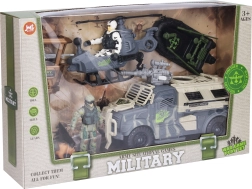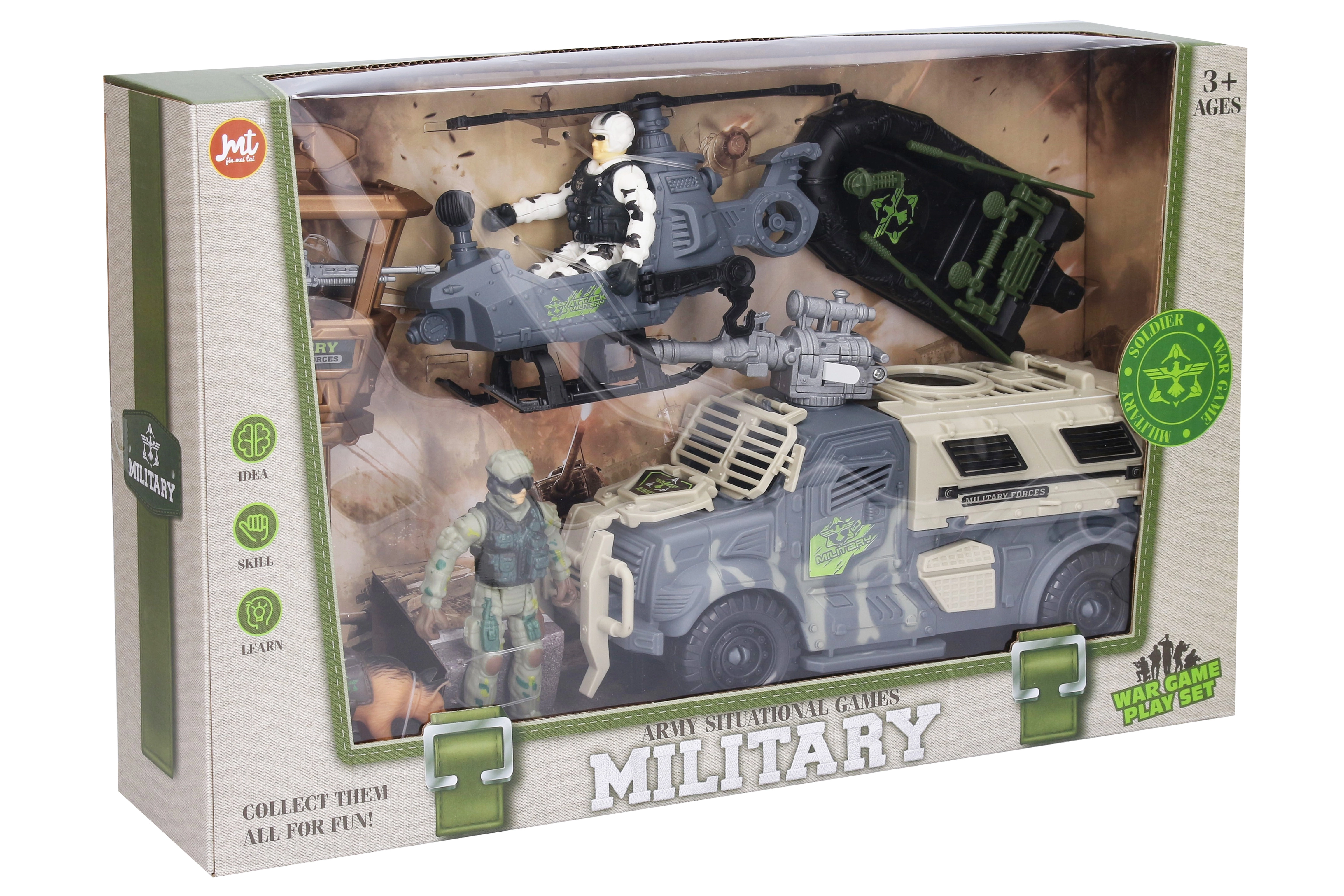 - Equipamiento completo: vehículo, helicóptero, lancha, torre, armas, perro y 2 figuras de soldados