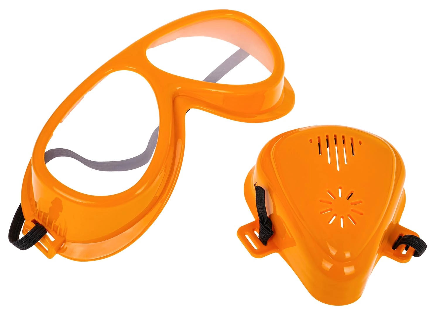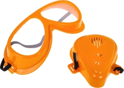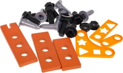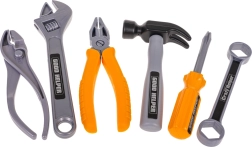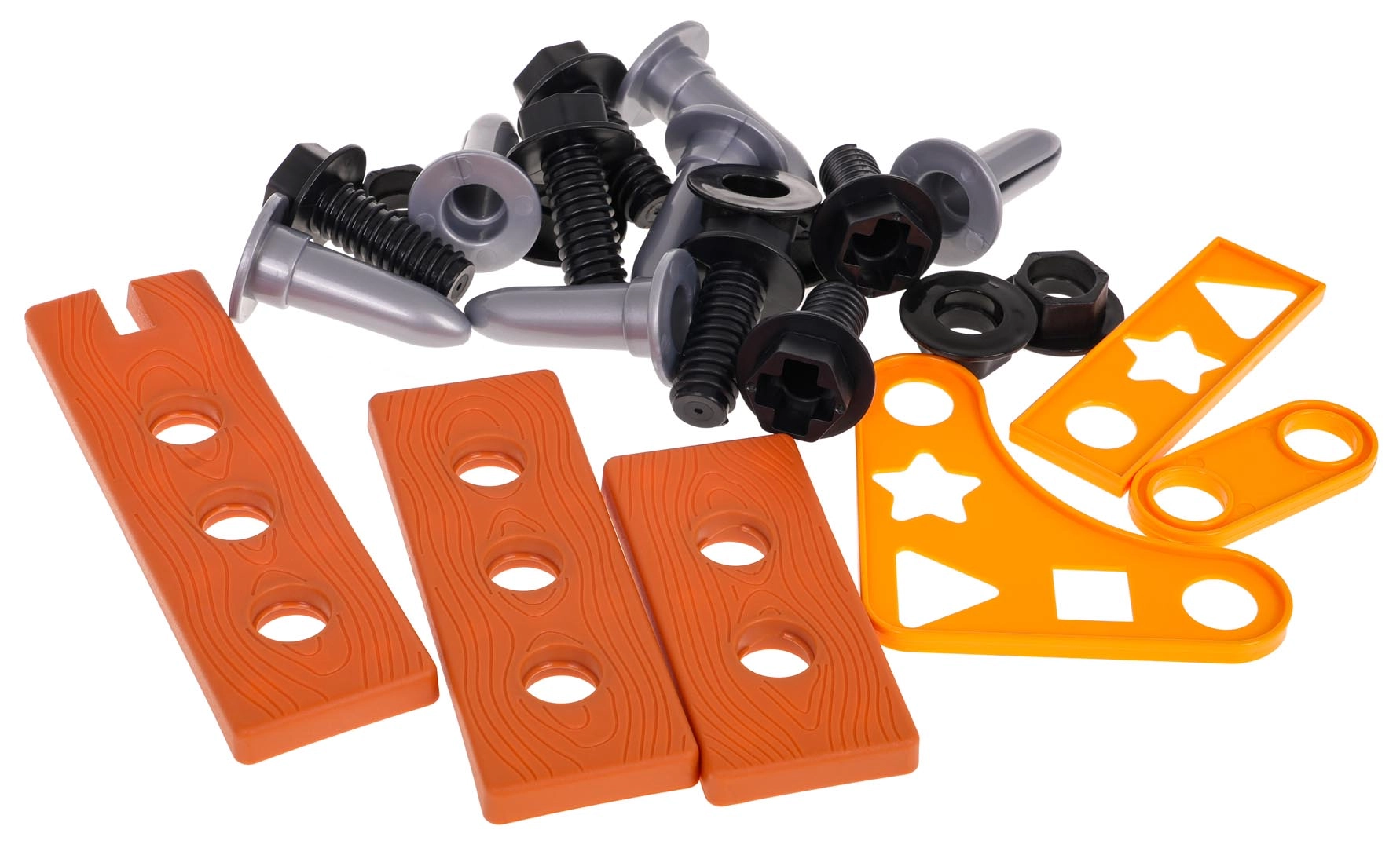 Destornillador, martillo, llaves, alicates, gafas y mascarilla de protección, listones de “madera” y material de fijación. Todo para construcciones creativas y entrenar la motricidad fina.
