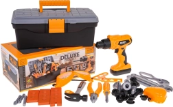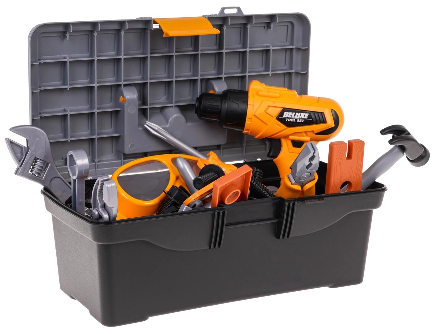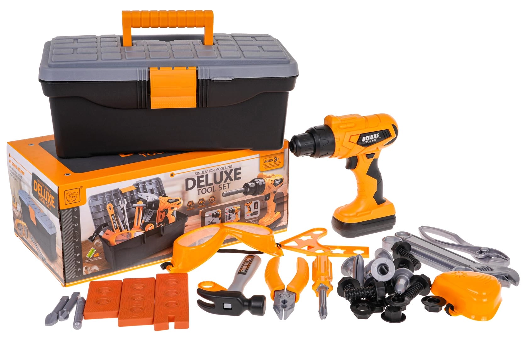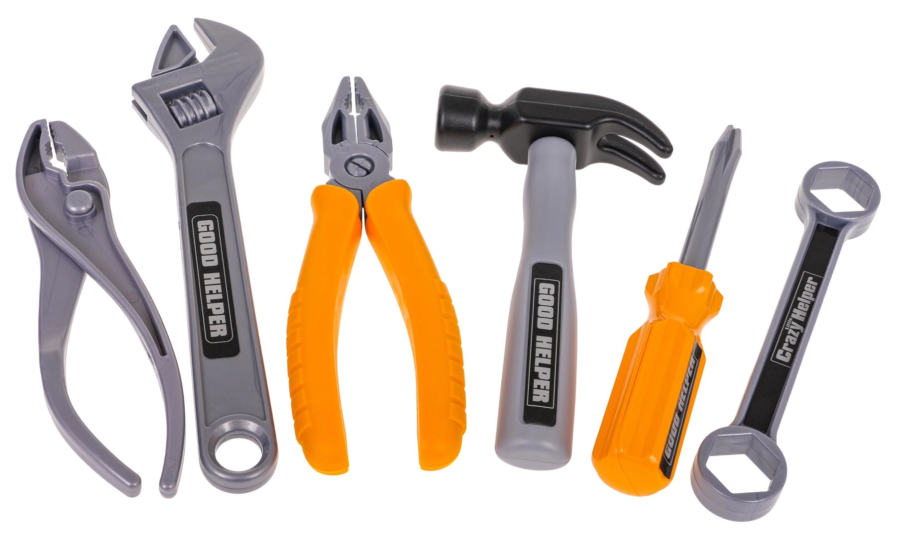 Este set de herramientas para niños ofrece todo lo que un pequeño manitas necesita: una gran caja de herramientas, gafas y mascarilla de seguridad, martillo, destornillador, alicates, llaves y piezas de construcción con tornillos y tacos. Gracias al plástico de calidad, el set es ligero, resistente e ideal para jugar a ser profesionales.