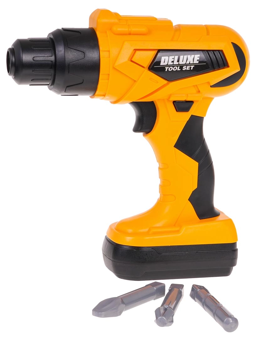 Taladro realista que atornilla y desatornilla, emite sonidos, cuenta con brocas intercambiables (plana, de cruz, broca) y “batería” extraíble. Alimentación: 2× AA 1,5 V (no incluidas).