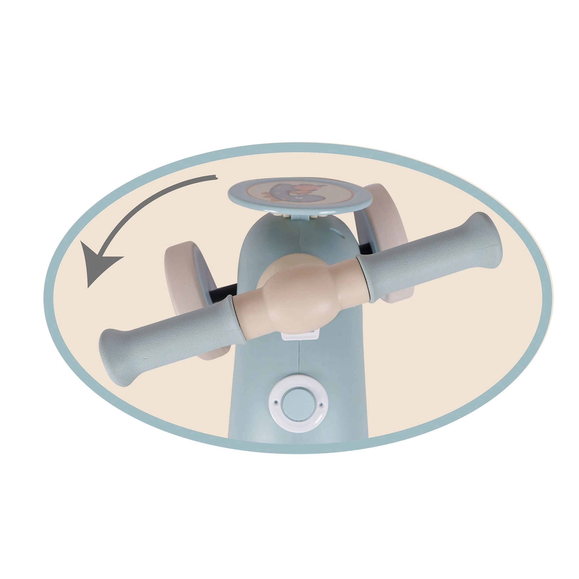 El manillar giratorio con sistema de seguridad evita pellizcos en los deditos y giros indeseados. Los puños engomados son agradables y antideslizantes.