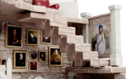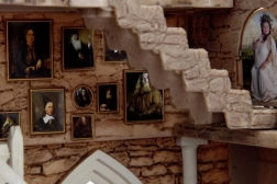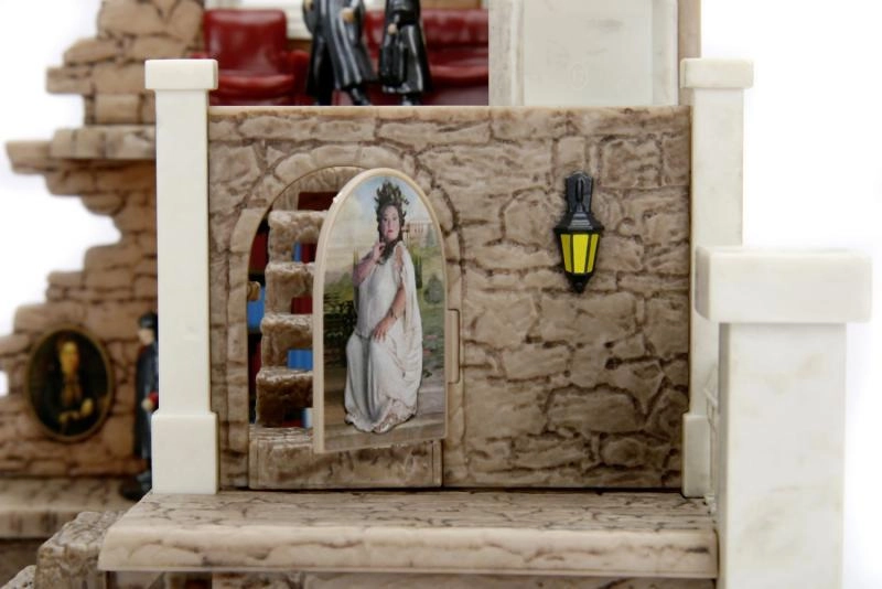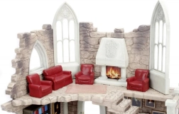 Pequeña maqueta de habitación con piedra antigua y ventanas ojivales góticas. Los sillones rojos alrededor de la chimenea subrayan el estilo gótico.
