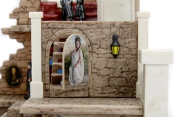 Miniatura de castillo de piedra con pilares y una pequeña lámpara exterior, adecuada para exhibir o jugar.
