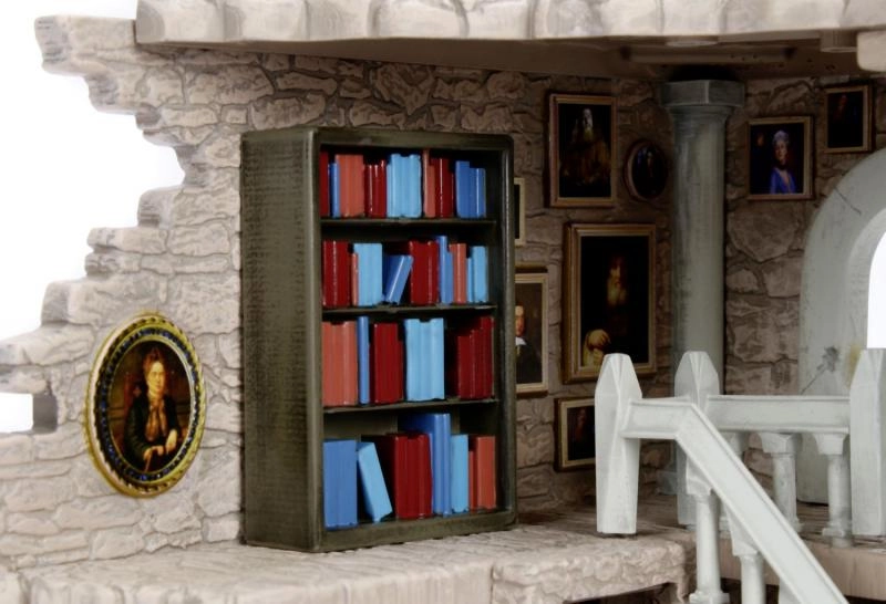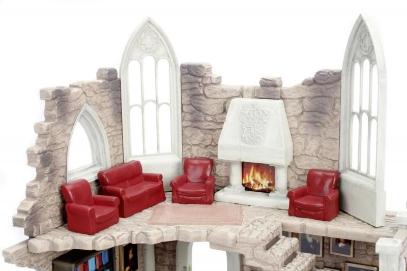 La Torre de Gryffindor presenta un diseño detallado con varios niveles, sofás rojos, chimenea y elementos decorativos como cuadros, ideal para jugar con las figuras.
