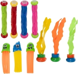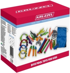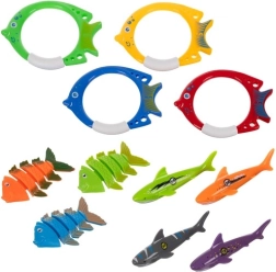 Este completo set para buceo y juegos en el agua está diseñado para la diversión y el desarrollo de las habilidades de natación. Gracias a los colores vivos y a las distintas formas, los niños encuentran fácilmente los objetos bajo la superficie, entrenan la orientación, el buceo y la coordinación. Las marcas de puntuación en algunas piezas fomentan la competición saludable y crean muchos escenarios de juego.