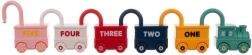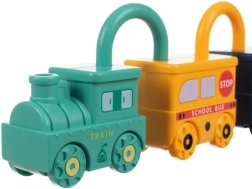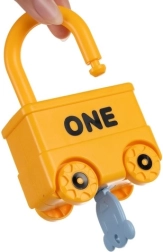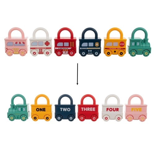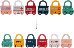 Este ingenioso juguete educativo combina diversión con aprendizaje significativo. Cada vehículo es una cerradura y a cada uno le corresponde una llave con forma de osito con el número grabado del 0 al 5. El niño entrena de forma natural la motricidad fina, el pensamiento lógico y el reconocimiento de números. La parte superior del candado puede girar 360°, y tras desbloquear correctamente, los vehículos se unen fácilmente en un tren largo.