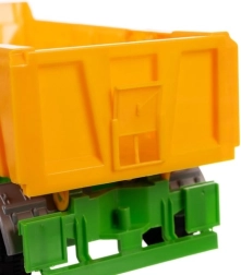 El remolque con volcado hidráulico descarga la carga fácilmente. La puerta trasera abatible y la compuerta deslizante permiten dosificar el contenido en porciones más pequeñas, mientras que la pata de apoyo delantera estabiliza el remolque al volcar. Las superficies lisas de plástico ABS se limpian rápidamente con un paño húmedo, para que el juego continúe cada día.