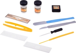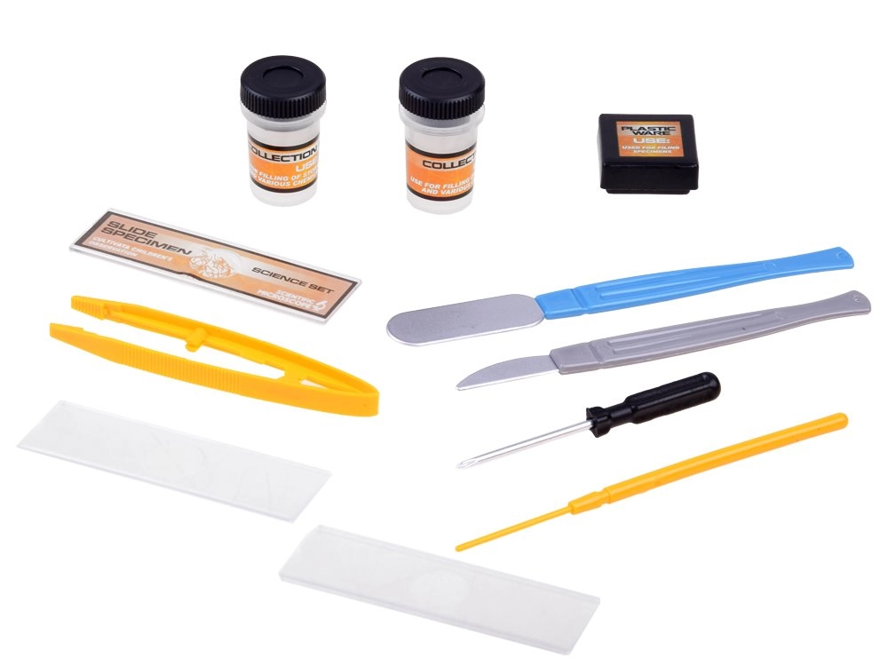 El paquete incluye portaobjetos, frascos para muestras, pinzas, cuentagotas, bisturí, aguja y otras herramientas: todo listo para experimentos en casa.