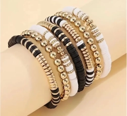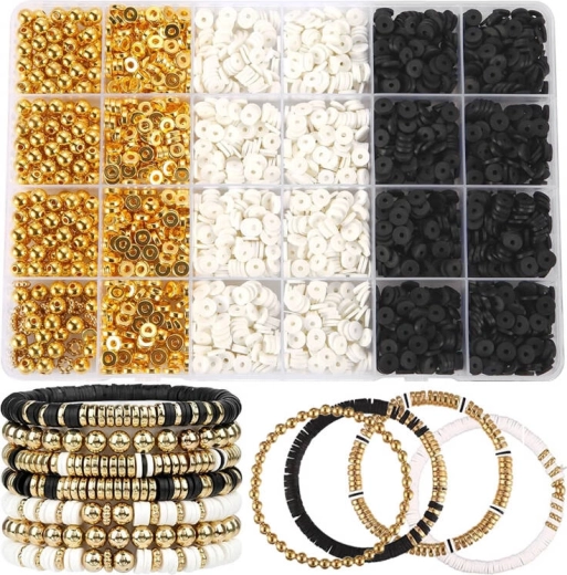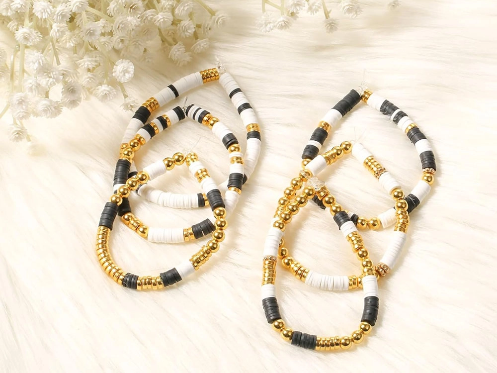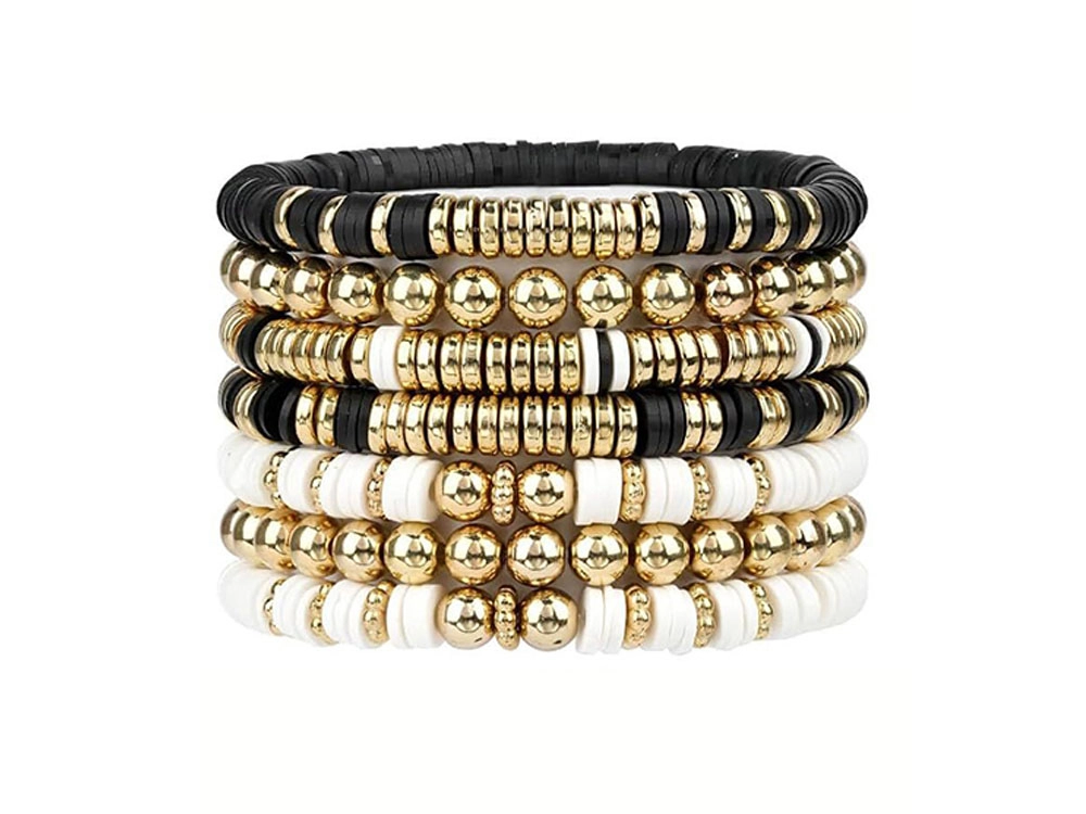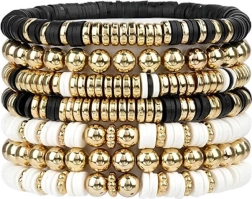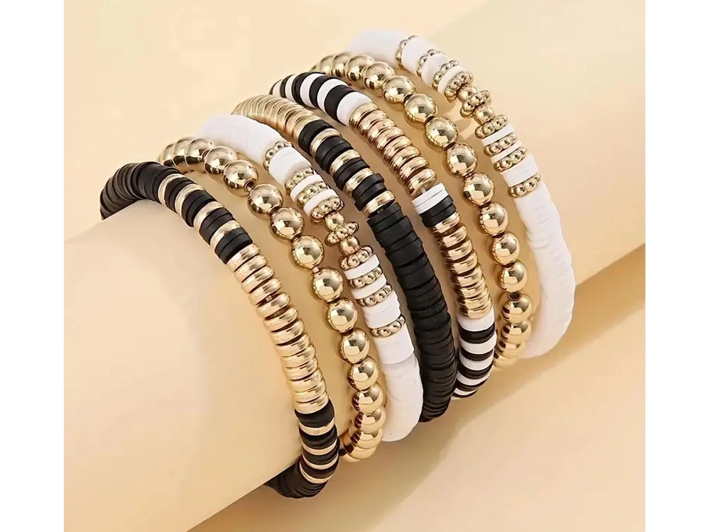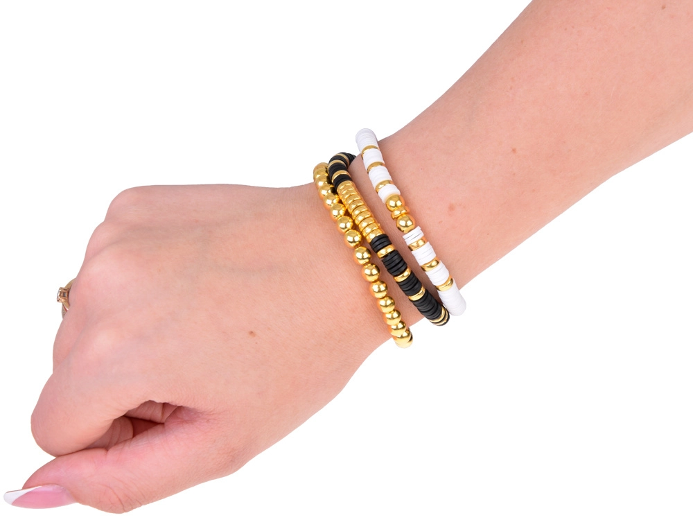 Las pulseras con estilo de este kit están hechas con cuentas negras, blancas y doradas, que crean un aspecto sofisticado en capas, ideal para cualquier ocasión.