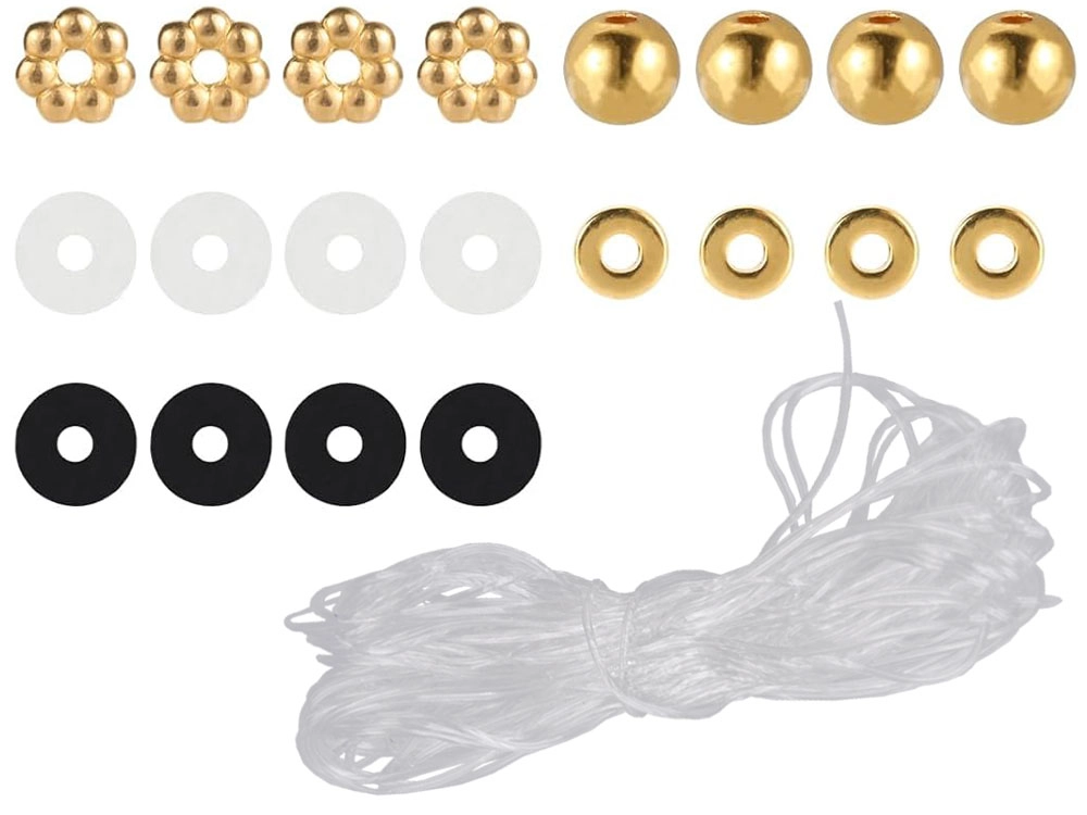 Los componentes del kit pueden utilizarse para crear todo tipo de joyas, como pulseras, collares o pendientes. Las cuentas doradas añaden un elemento decorativo.