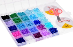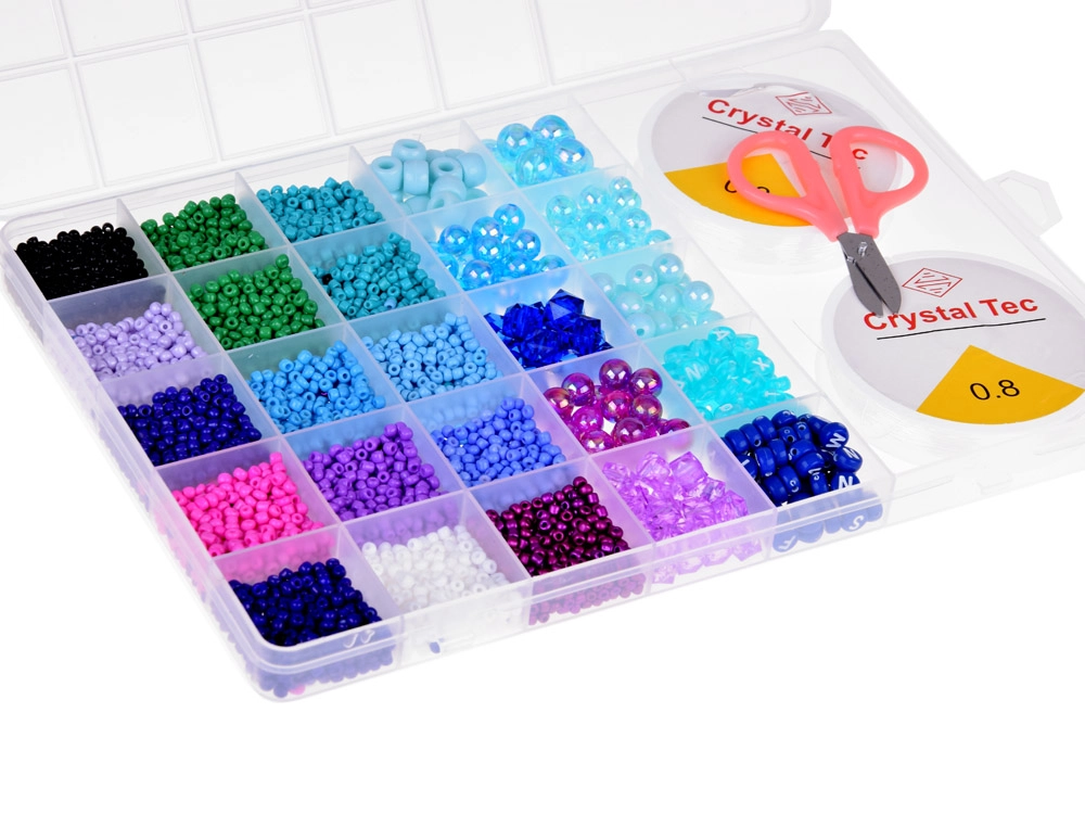 El set viene en un práctico estuche transparente tipo maletín, dividido en compartimentos que evitan que las cuentas se mezclen. El set también incluye 2 bobinas de hilo transparente y tijeras, lo que te permite empezar a trabajar de inmediato en las joyas de tus sueños.