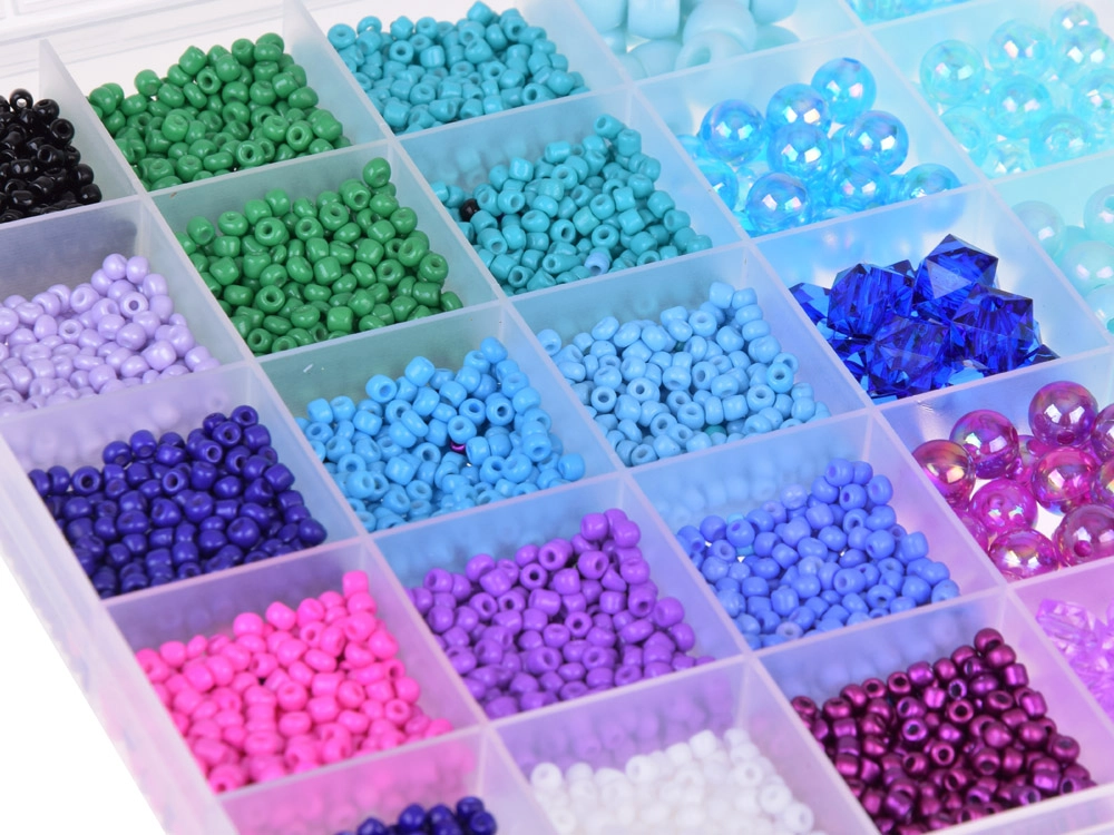 El set se entrega en un estuche organizado que facilita la clasificación y el almacenamiento de las cuentas, ideal para guardar y transportar.