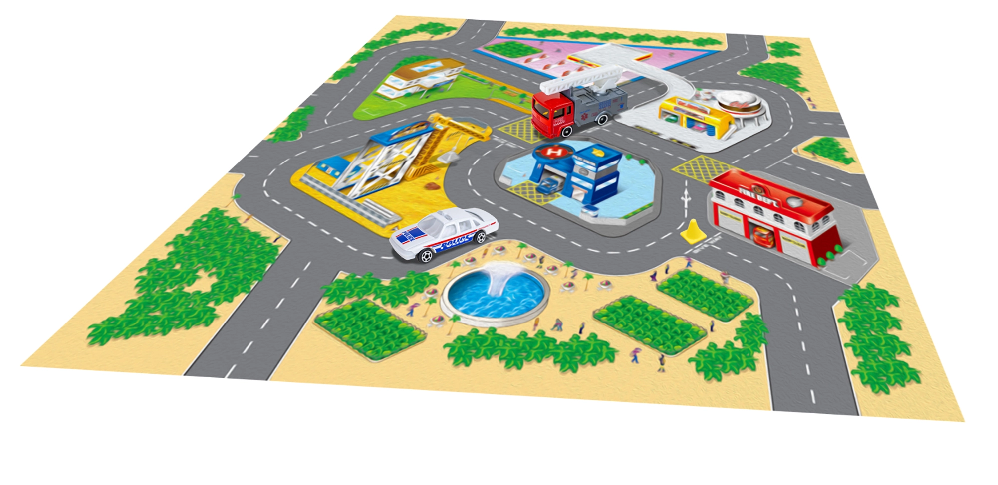 Elige entre 4 motivos diferentes que fomentan el juego creativo y el aprendizaje de situaciones de tráfico: servicios de rescate, aeropuerto, construcción y carreras. Cada paquete incluye 2 vehículos de transporte metálicos que combinan perfectamente con el mapa seleccionado.