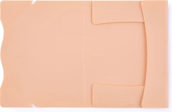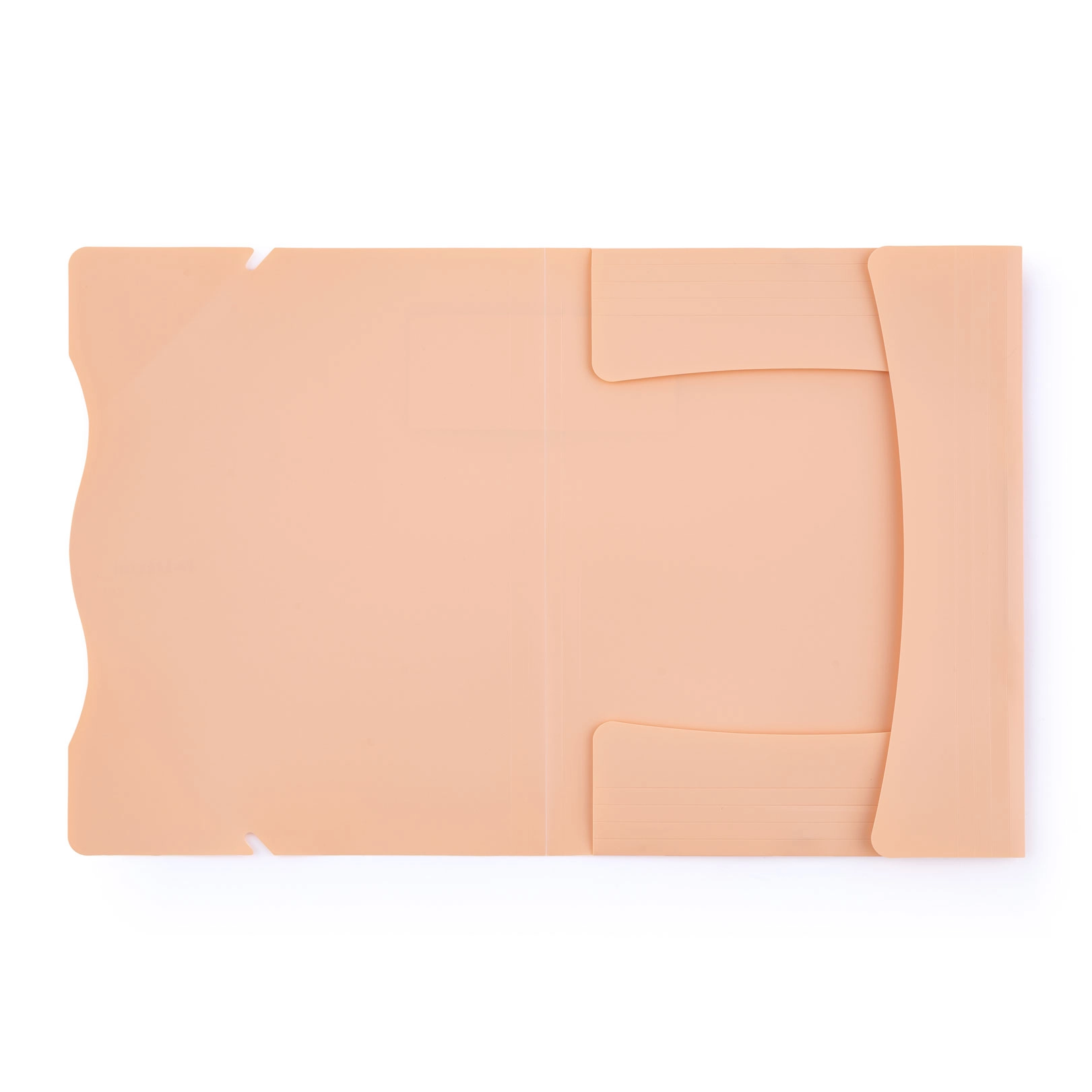 Carpeta con tres solapas de polipropileno en color pastel albaricoque, ofrece cierre mediante goma elástica y lomo extensible con capacidad de hasta 250 hojas en formato A4.
