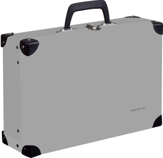 Práctico y elegante maletín PASTELINI en color gris, ideal para el transporte y almacenamiento diario de objetos. Gracias a la lámina resistente, al cierre metálico, al asa de plástico y a las esquinas de protección, ofrece una protección fiable para juguetes, material de arte o útiles escolares.