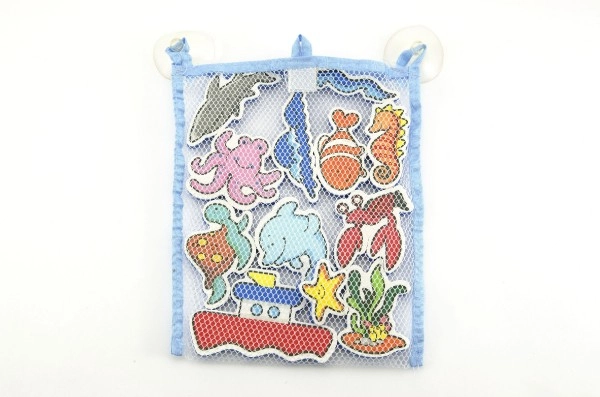 Mantenimiento: Después del baño, lava las pegatinas con agua tibia, sécalas bien y déjalas airearse. La bolsa de malla se puede lavar a mano en agua tibia con jabón.