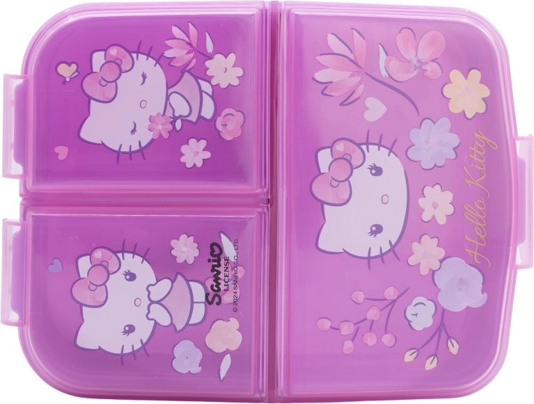 La práctica caja multiusos para almuerzo con licencia oficial de Hello Kitty entusiasma a los niños con su alegre diseño y a los padres con su organización inteligente. Las tres secciones independientes permiten empacar, por ejemplo, fruta y verdura, un sándwich y un pequeño snack sin que se mezclen los sabores. Gracias a sus dimensiones compactas cabe en la mochila o el bolso escolar, y los clips seguros mantienen el contenido en su lugar.