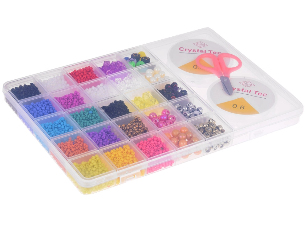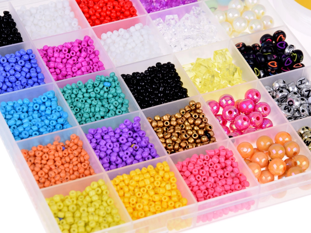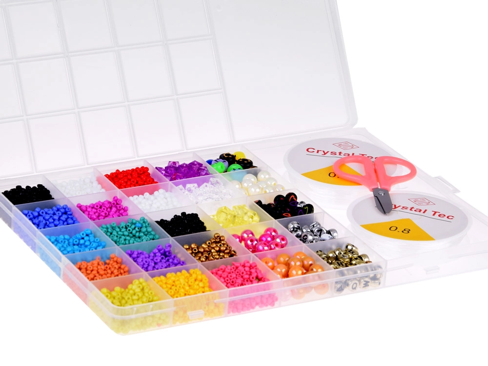 Este completo set es ideal para hacer pulseras, collares, colgantes y otros accesorios. Gracias a la amplia gama de tonos azules, turquesas, morados, rosas, verdes y blancos y a las diversas formas de las cuentas, crearás accesorios originales para cualquier ocasión. El organizador con compartimentos mantiene todo en orden: las cuentas no se mezclan y el trabajo es rápido y cómodo.