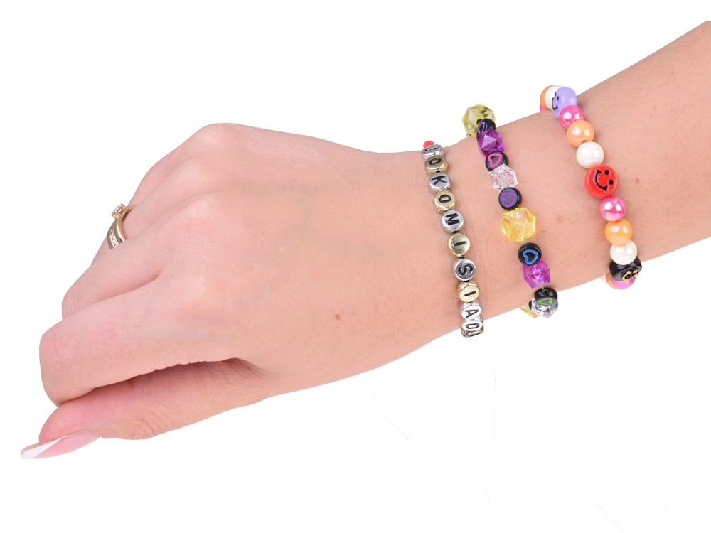 En el paquete recibes todo lo necesario para crear de inmediato: 2 bobinas de cordón elástico transparente para un ensartado sencillo y tijeras para cortes precisos. Las cuentas con letras permiten crear nombres, palabras y mensajes, haciendo que cada joya sea única.