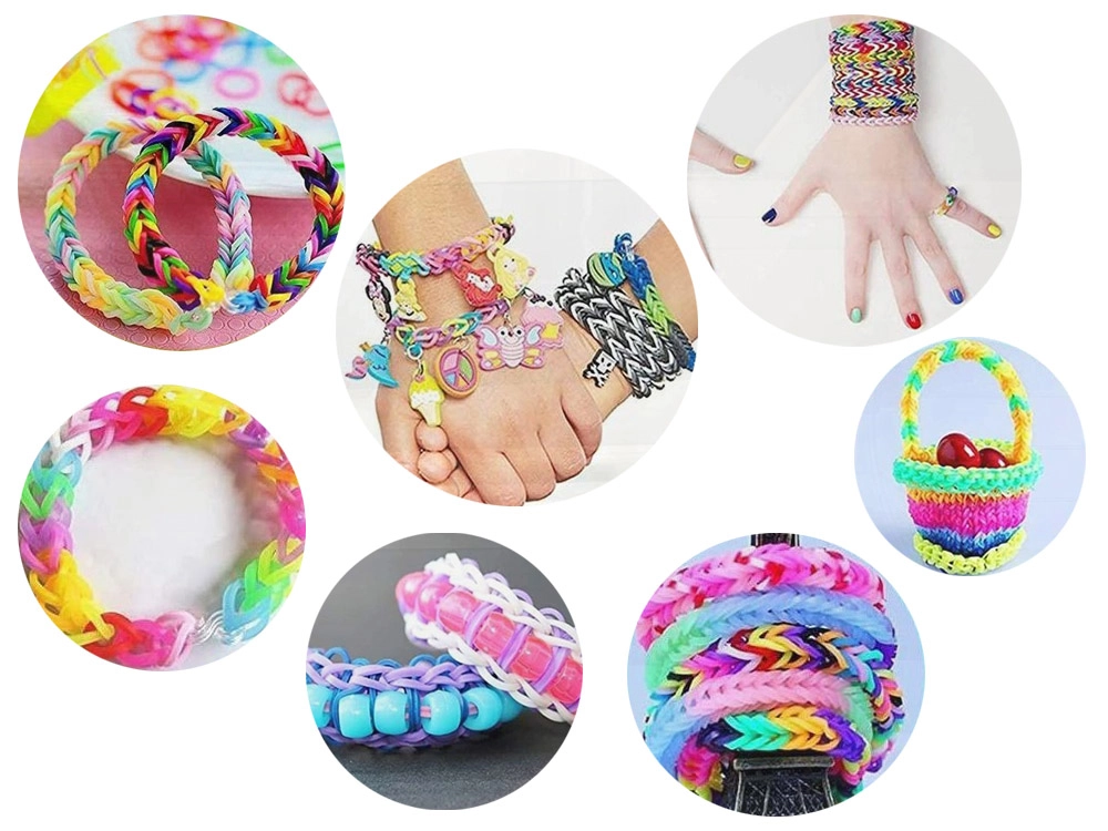 - aprox. 4500 uds de gomas, ganchos de unión transparentes, cuentas de colores/pastel, 6× ganchos pequeños, 1× gancho grande, 2× honda, 2× telar, 6× colgante de silicona, organizador transparente con compartimentos