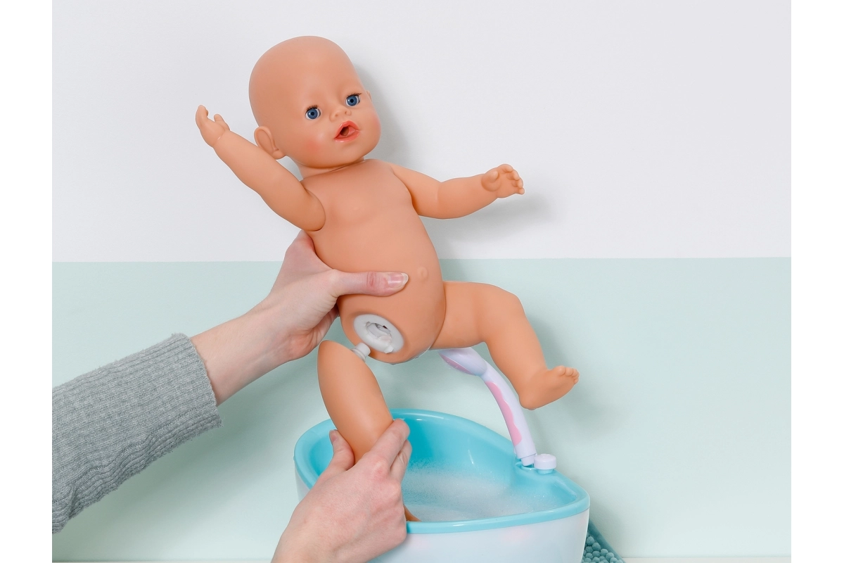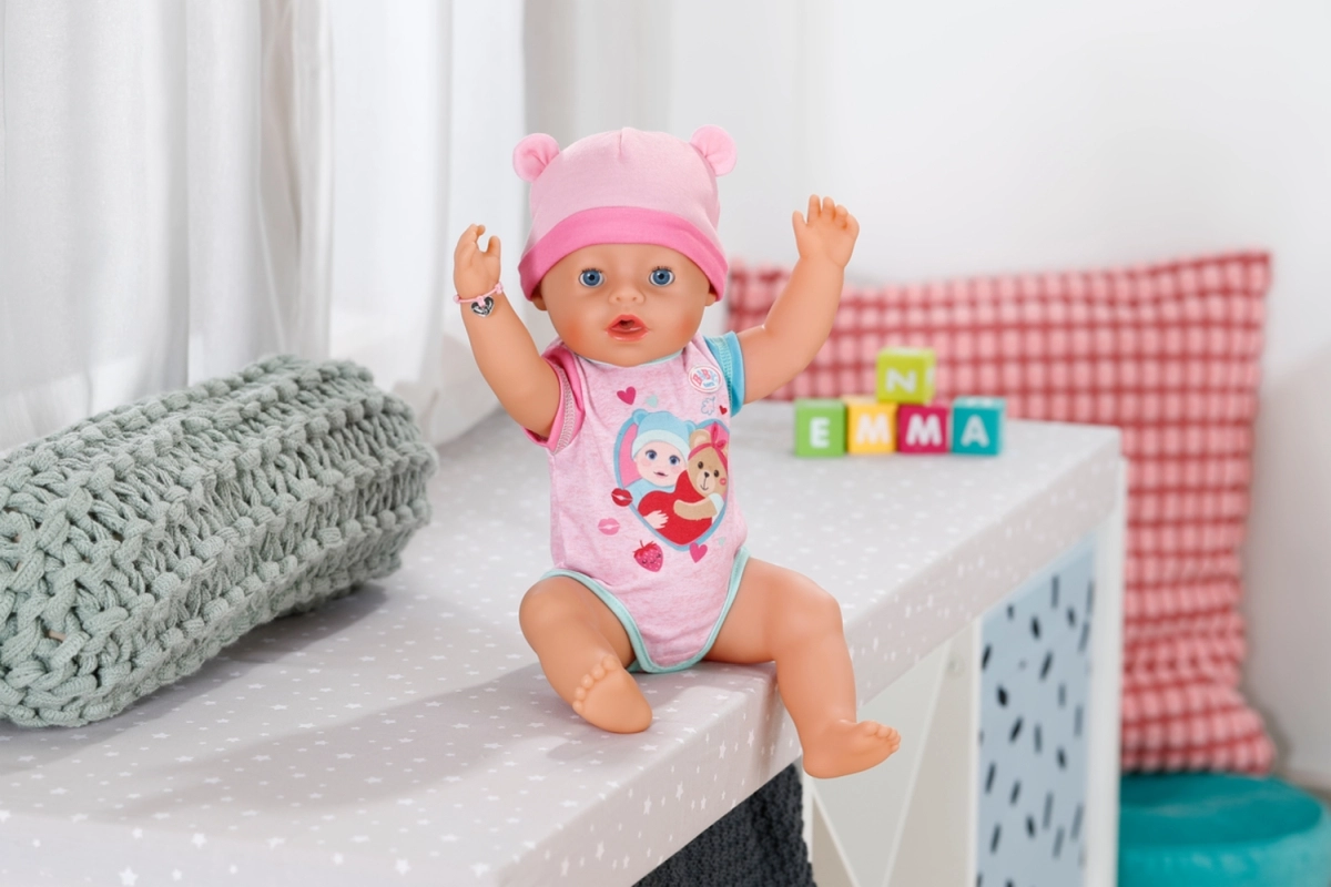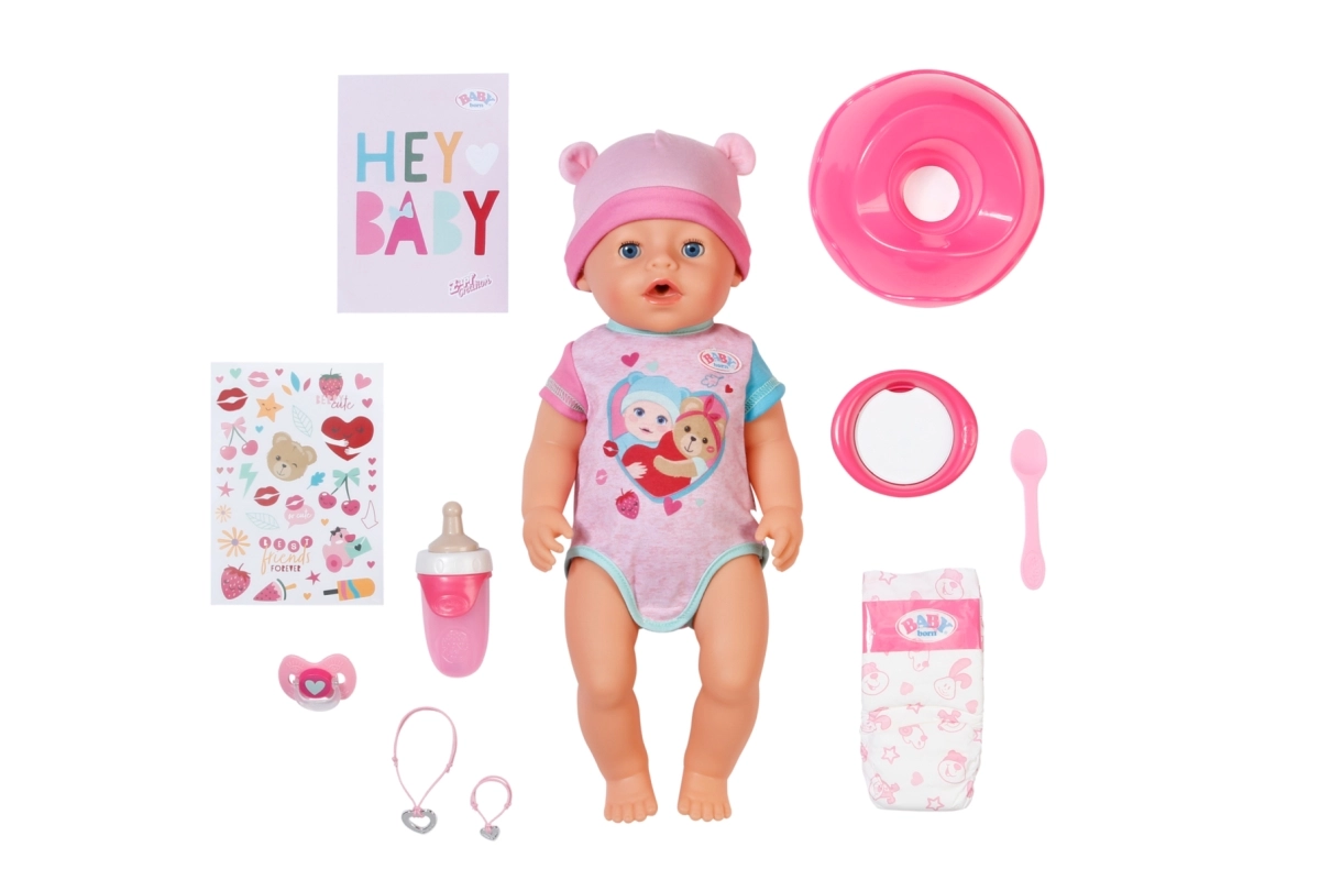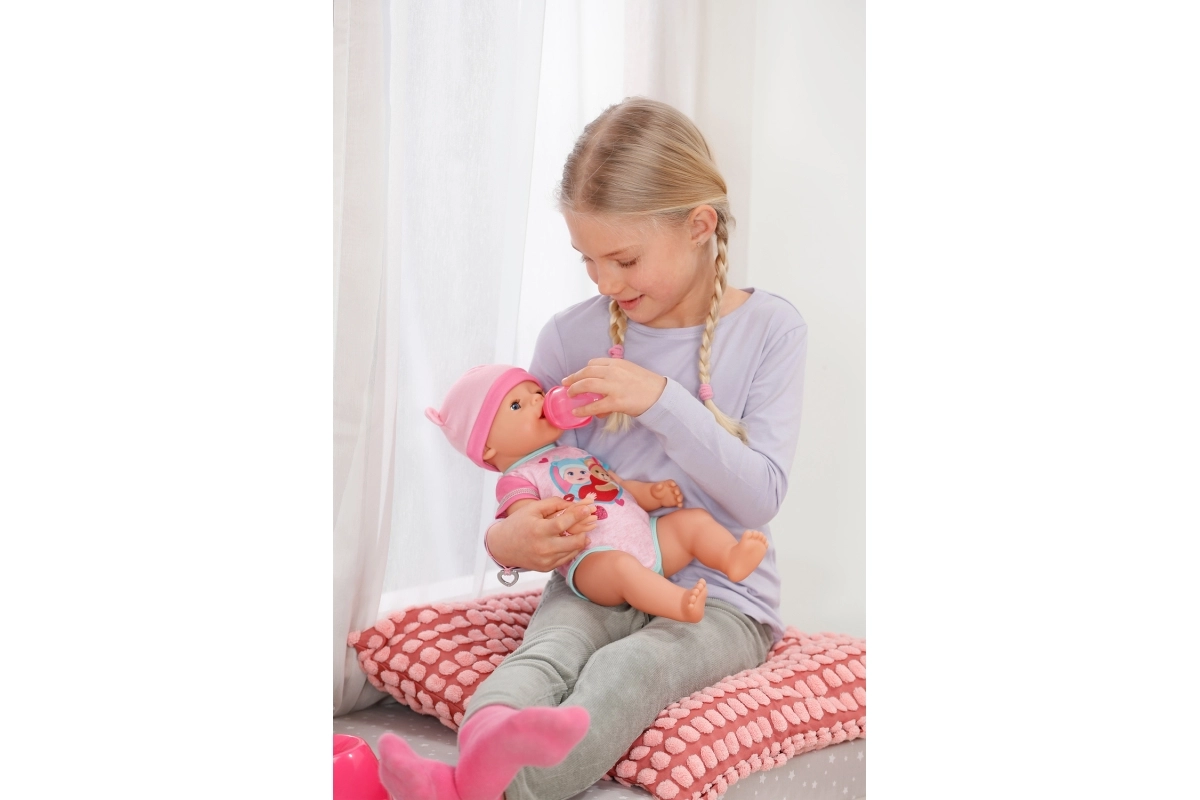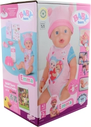 Emma es una adorable muñeca BABY born con funciones realistas que encantan a los niños. Bebe agua del biberón, al girar el chupete abre y cierra los ojos, puede llorar lágrimas y hacer pis en el pañal o en el orinal. Gracias a su diseño resistente, también se puede bañar, para disfrutar de mucha diversión dentro y fuera de la bañera.