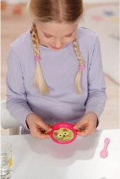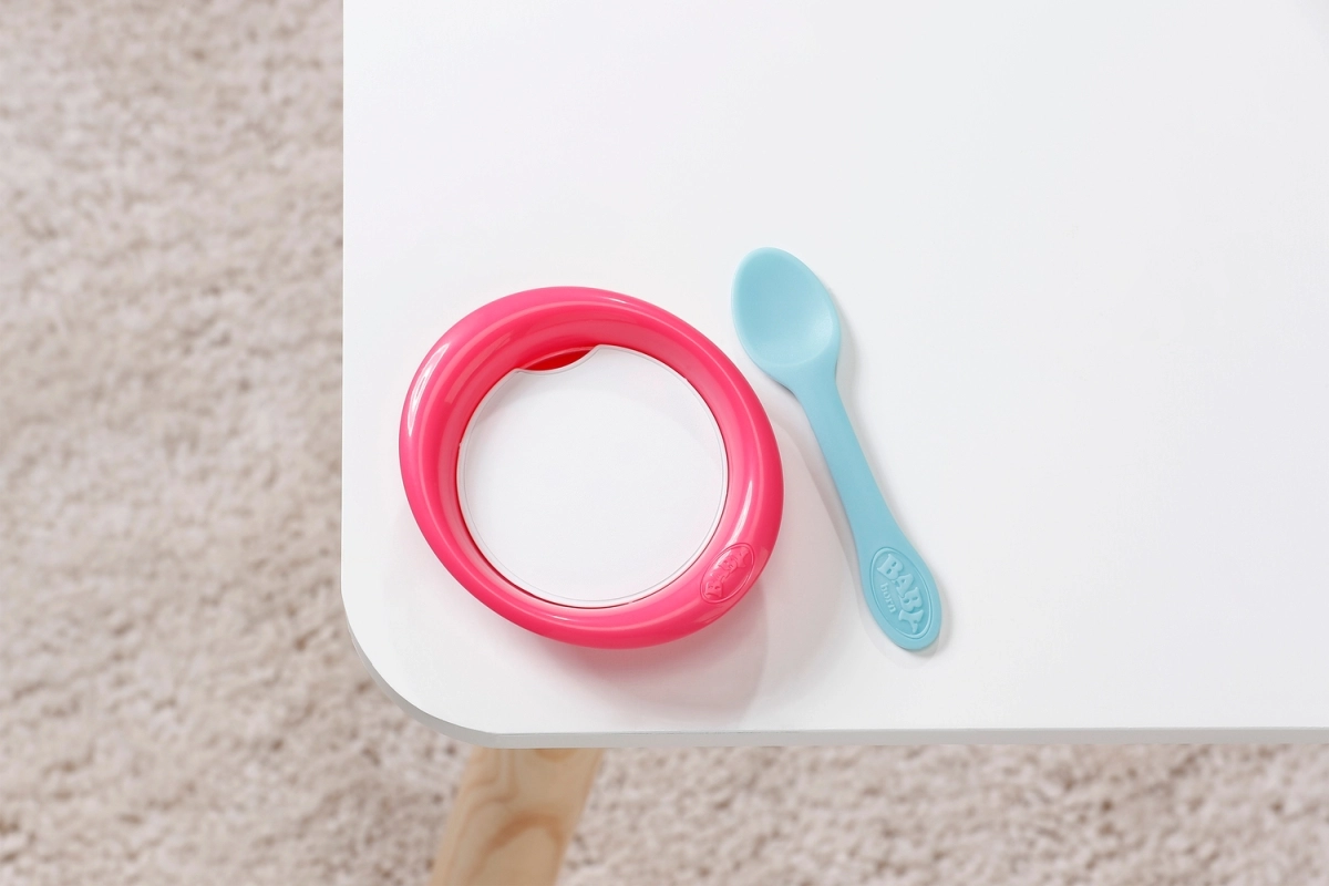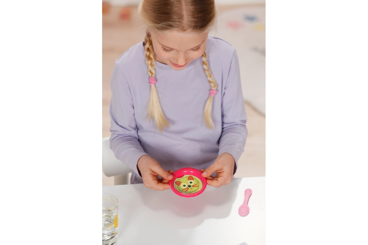El set incluye un platito mágico, en el que aparece la comida al contacto con el agua, y un orinal donde “mágicamente” se muestra si ha hecho pis o caca, ideal para practicar las rutinas de cuidado diario. El amplio equipamiento y la posibilidad de cambiar la ropa desarrollan la imaginación, la empatía y la motricidad fina.
