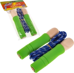 Cuerda para saltar infantil con mangos de madera y puntas de goma antideslizantes, ideal para niños a partir de 5 años. Ofrece una excelente oportunidad para pasar tiempo activo al aire libre.