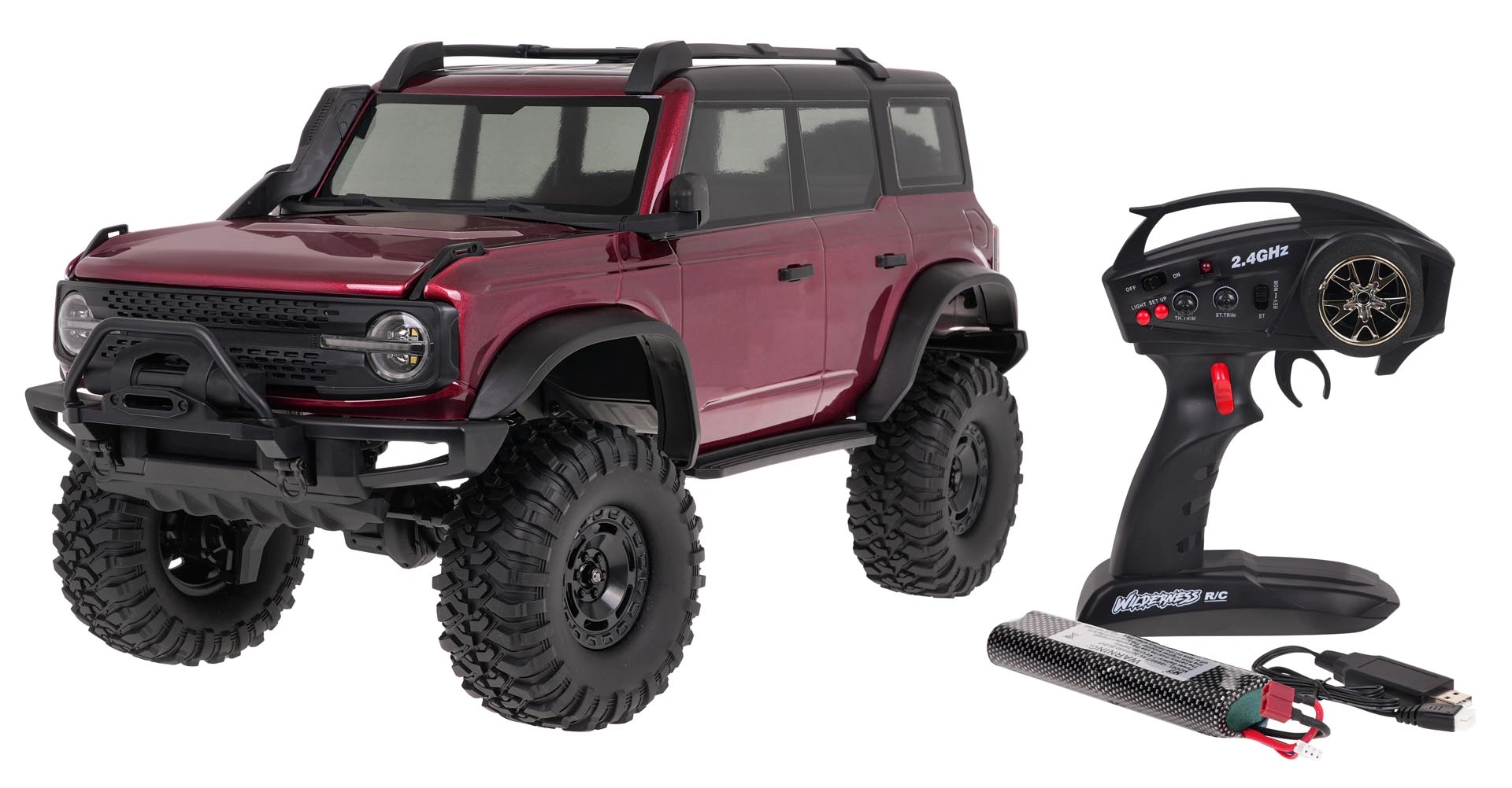 El RC crawler WILDERNESS a escala 1:10 combina una construcción robusta con una carrocería detallada. La suspensión independiente de cada rueda, las bieletas metálicas en los brazos y los diferenciales delantero y trasero ofrecen excelente tracción en terrenos irregulares. Los grandes neumáticos de goma con dibujo profundo y el ángulo de giro extraordinariamente amplio superan rocas, raíces y bordillos.
