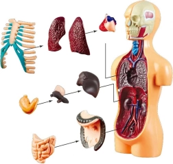 Este modelo anatómico de torso, elaborado con detalle, permite conocer de forma clara la disposición de los órganos humanos. Gracias a las partes extraíbles (pulmón derecho, pulmón izquierdo, corazón, hígado, estómago, páncreas, intestino delgado e intestino grueso, costillas) es fácil aprender su ubicación y sus relaciones.