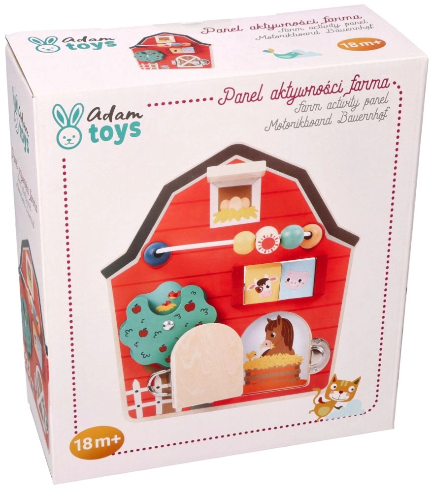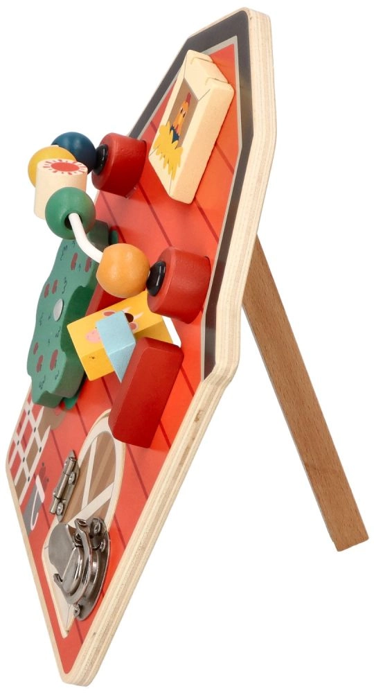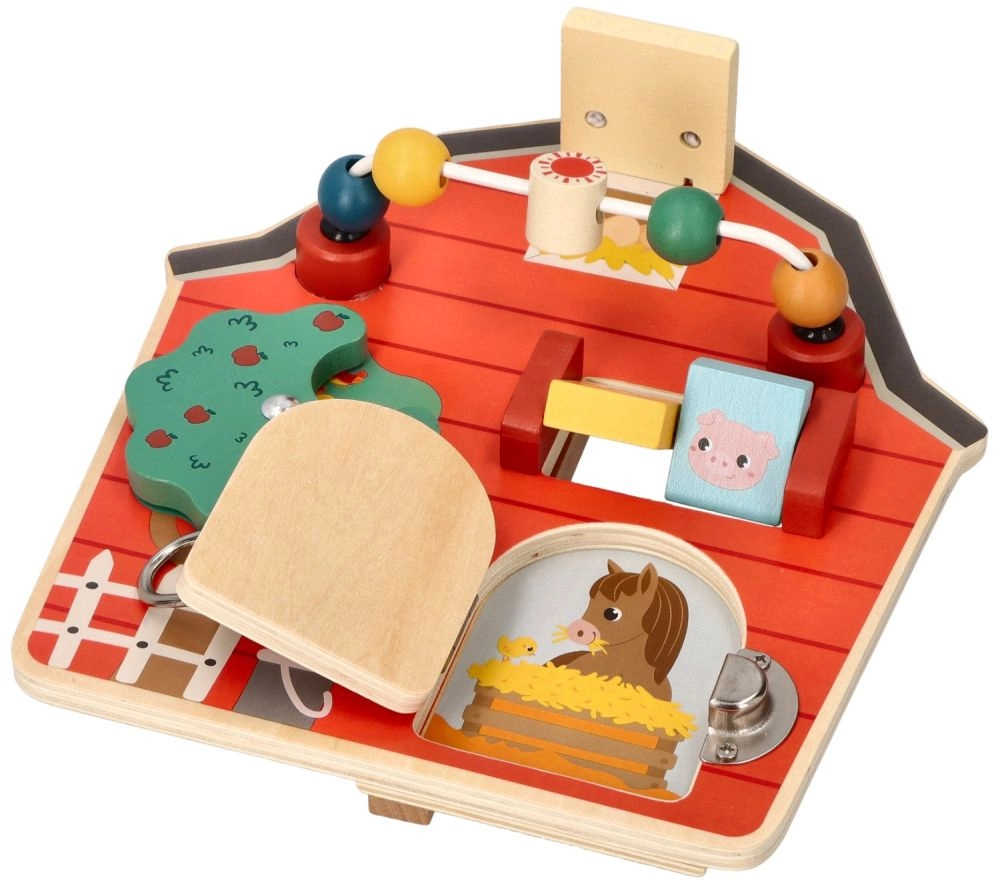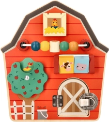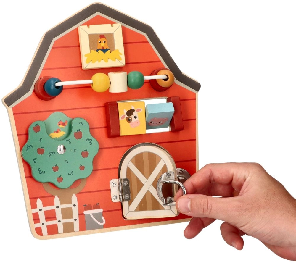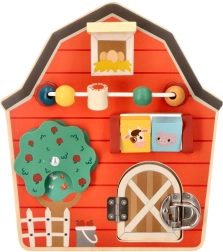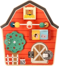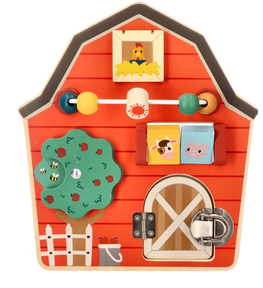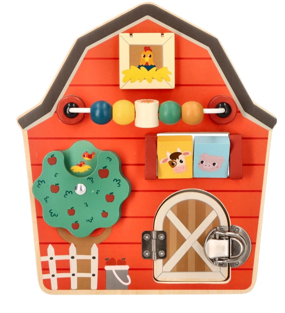 Este tablero de actividades de madera con forma de granero está diseñado para potenciar la motricidad fina y la diversión de los niños. Con un colorido tema de granja, no solo educa, sino que también entretiene a los más pequeños. Los elementos interactivos como cuentas deslizantes, un árbol giratorio y una puerta con pestillo ayudan a desarrollar la coordinación mano‑ojo.