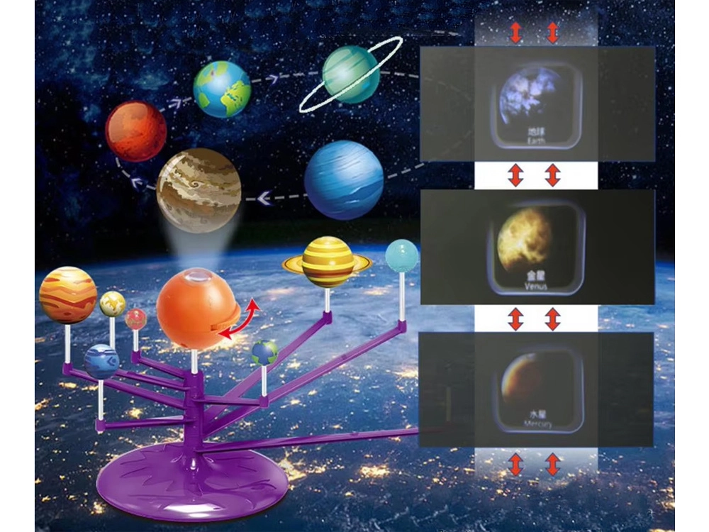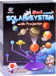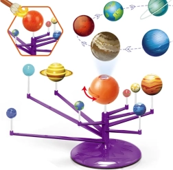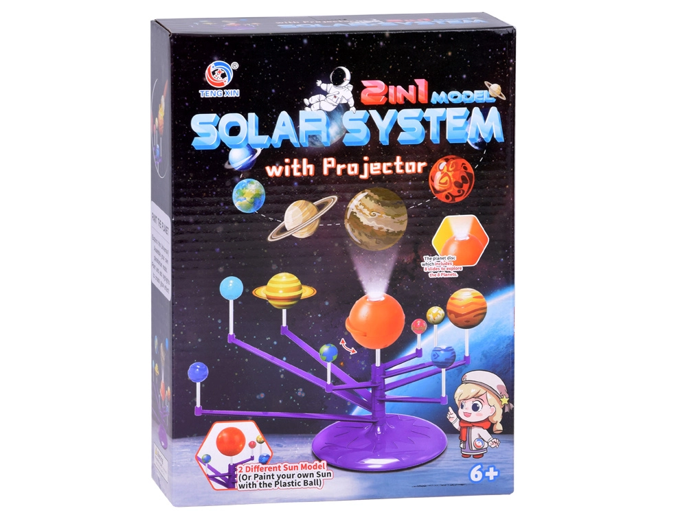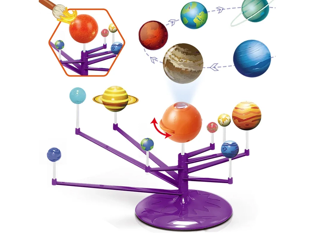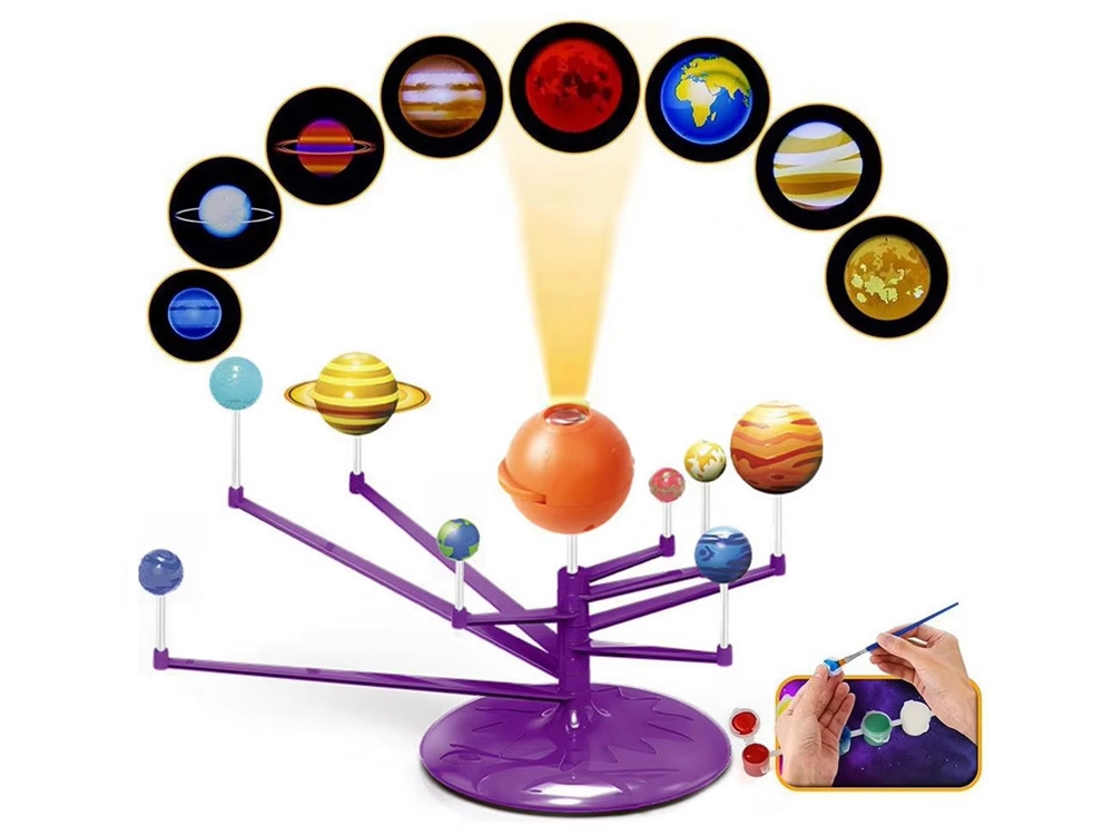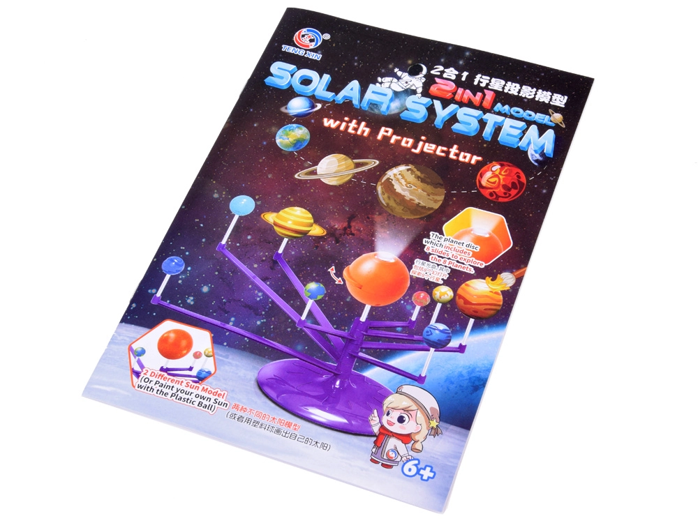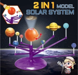 Mini modelo del Sistema Solar 2 en 1 es un juguete interactivo, creativo y educativo que permite a los niños montar y pintar de forma independiente los planetas. Incluye una esfera naranja que representa el Sol con proyector, que proyecta los planetas en el techo.