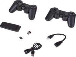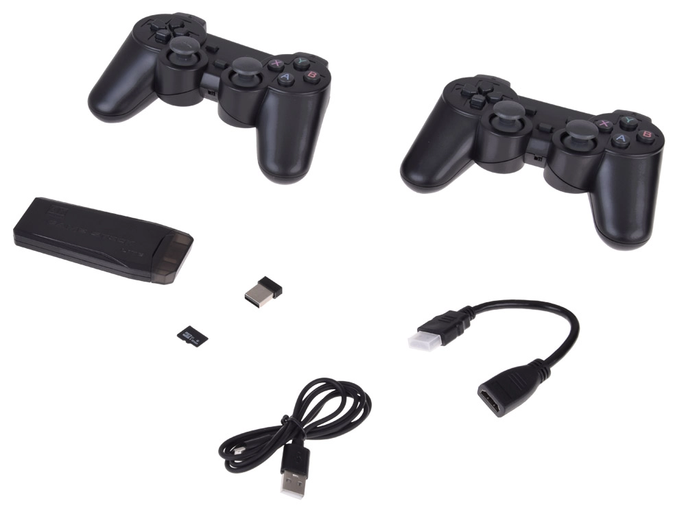 - 2 gamepads, 1 consola con tarjeta SD, cable HDMI, cable de alimentación USB, manual