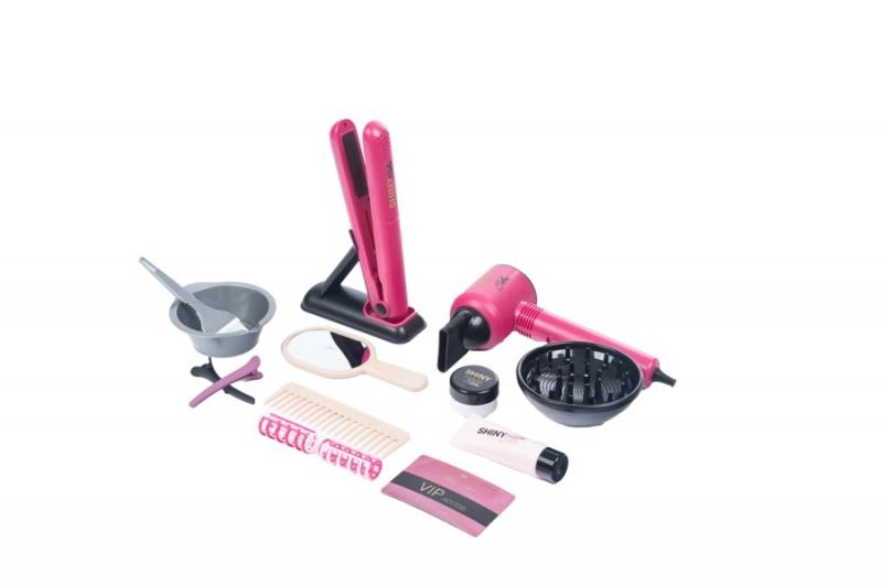 - Equipamiento completo: secador, plancha, peine, espejito, pinzas, rulos, cuenco y pincel para “tinte”, accesorios de cuidado, etc.