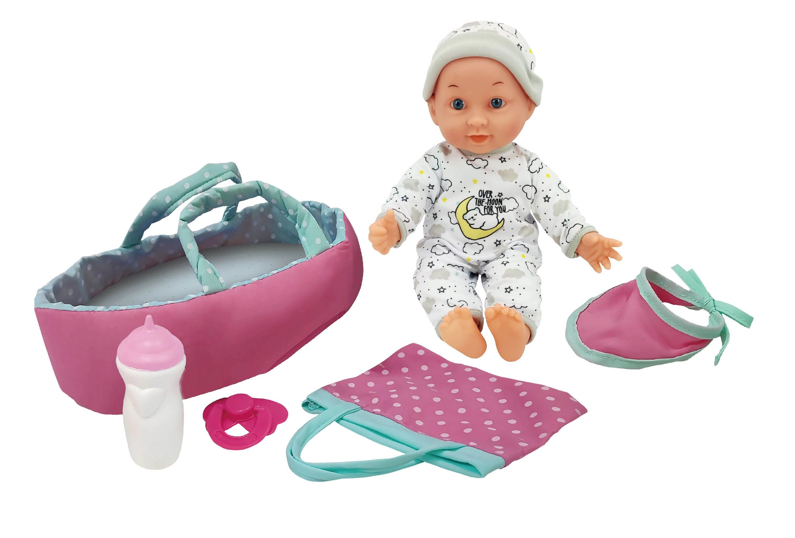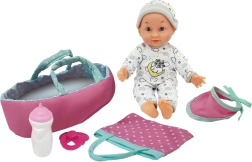 - Muñeca, bolsa de transporte, babero, biberón