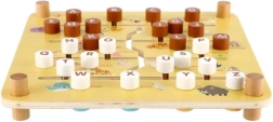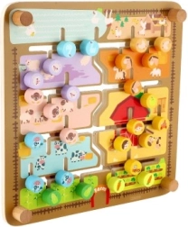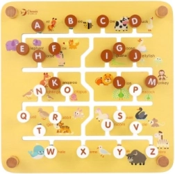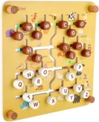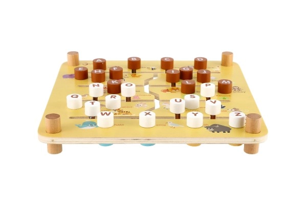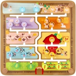 Una ayuda inteligente y divertida para preescolares: el tablero de doble cara esconde dos mundos. En la granja, los niños deslizan fichas con animales, caras y frutas por ranuras fresadas hasta su lugar. Al girar el tablero, se convierte en un laberinto del abecedario: la tarea es llevar la ficha con la letra inicial hasta el animal correcto (los nombres están en inglés), por lo que se practican letras y vocabulario de forma lúdica.