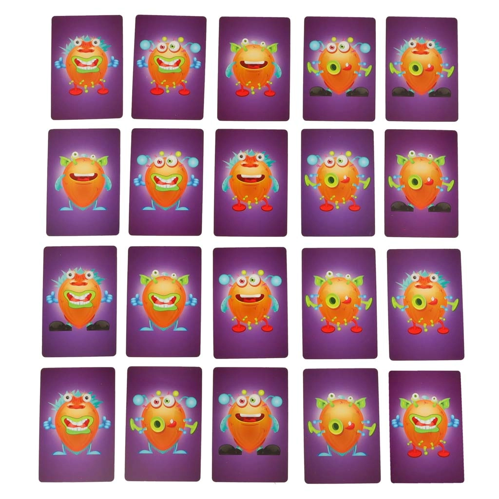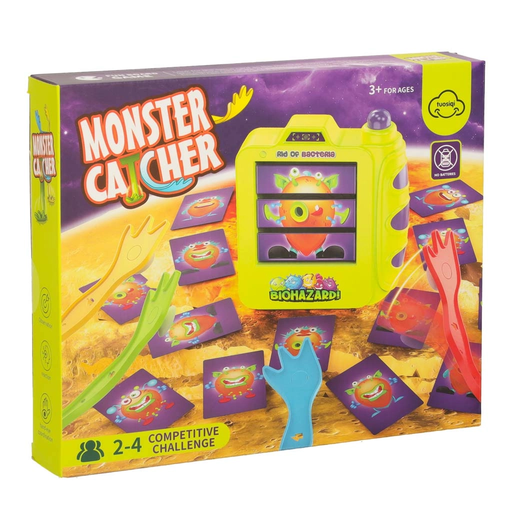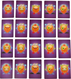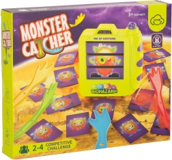 “Atrapa monstruos” es un juego dinámico para 2–4 jugadores a partir de 3 años. Un jugador revela la imagen del monstruo en la “cámara” de plástico y todos intentan encontrar lo antes posible la carta coincidente en la mesa. Quien la reconozca primero debe agarrarla al instante con la manita de colores ¡y gana un punto!