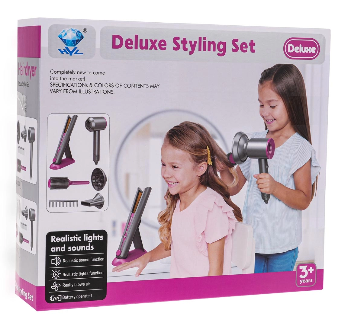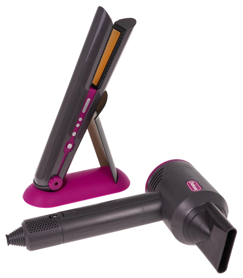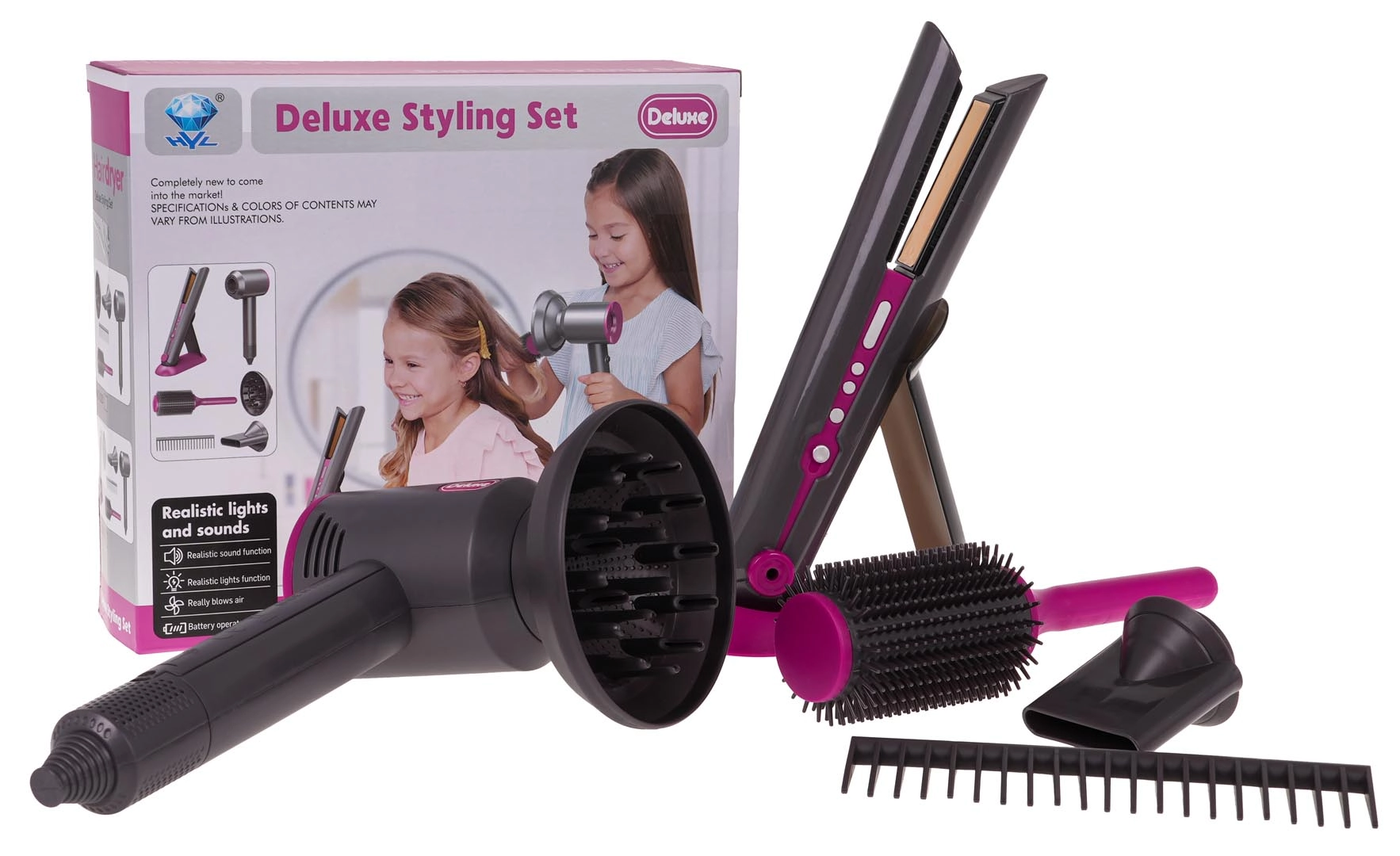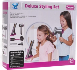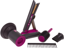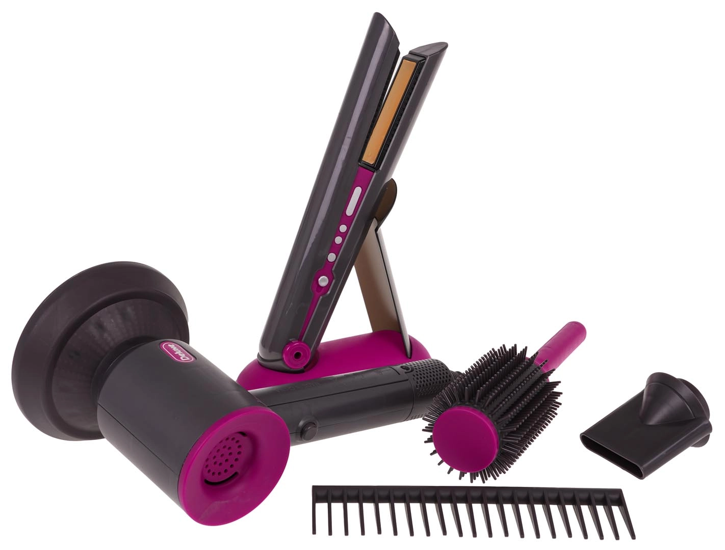 Juego de peluquería ideal para niños que quieren convertirse en pequeños peluqueros. Set ricamente equipado que incluye un secador con boquillas intercambiables, una plancha para el pelo, un peine y un cepillo. El secador funciona con dos pilas AA (no incluidas) y emite sonidos como un secado real. La plancha se ilumina al encenderla y emite sonidos característicos.