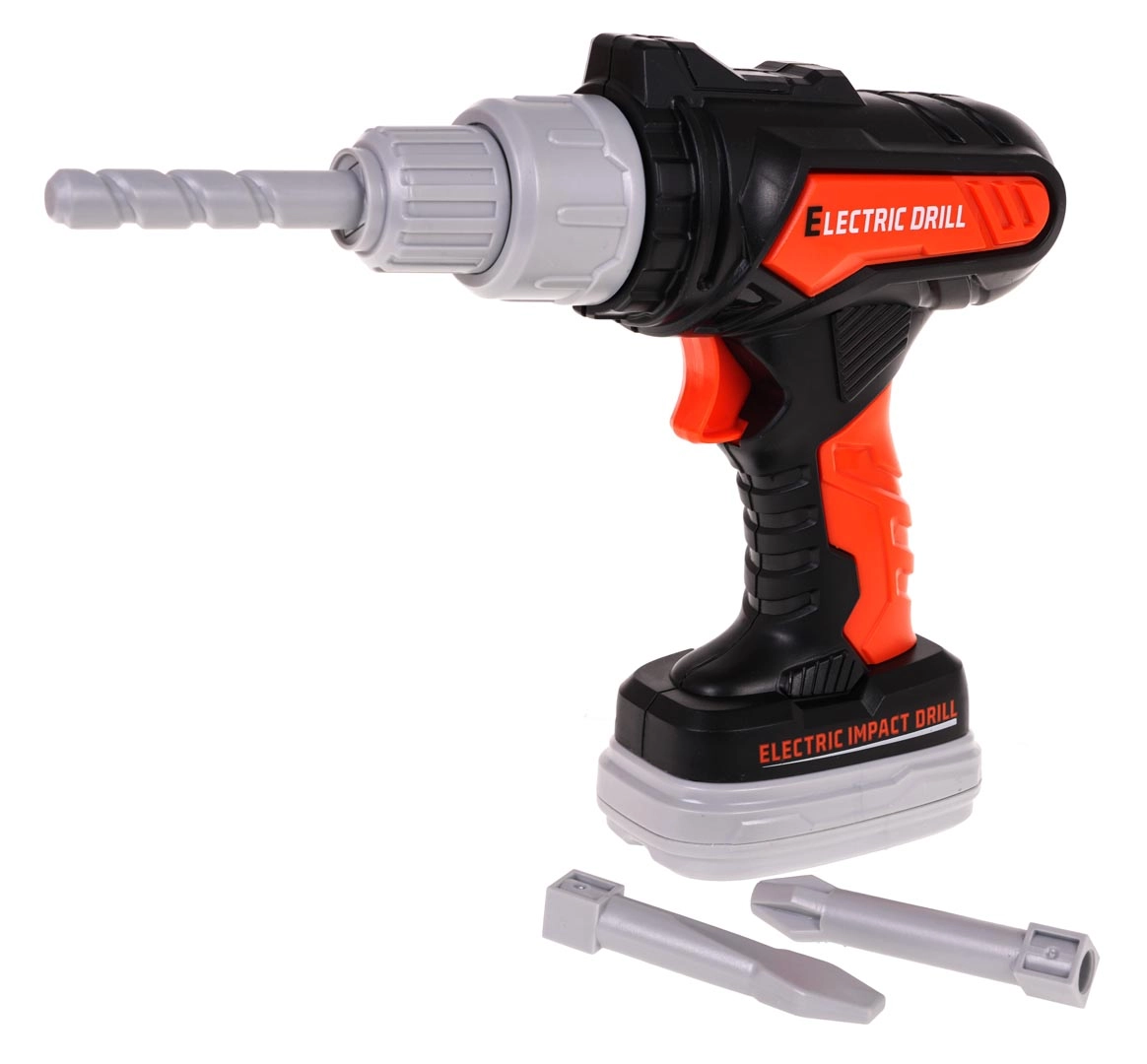 Taladro/destornillador infantil para 2× pilas AA con “batería” extraíble y cambio de sentido de giro para atornillar y desatornillar. Incluye puntas intercambiables: Phillips, plana y broca.