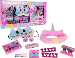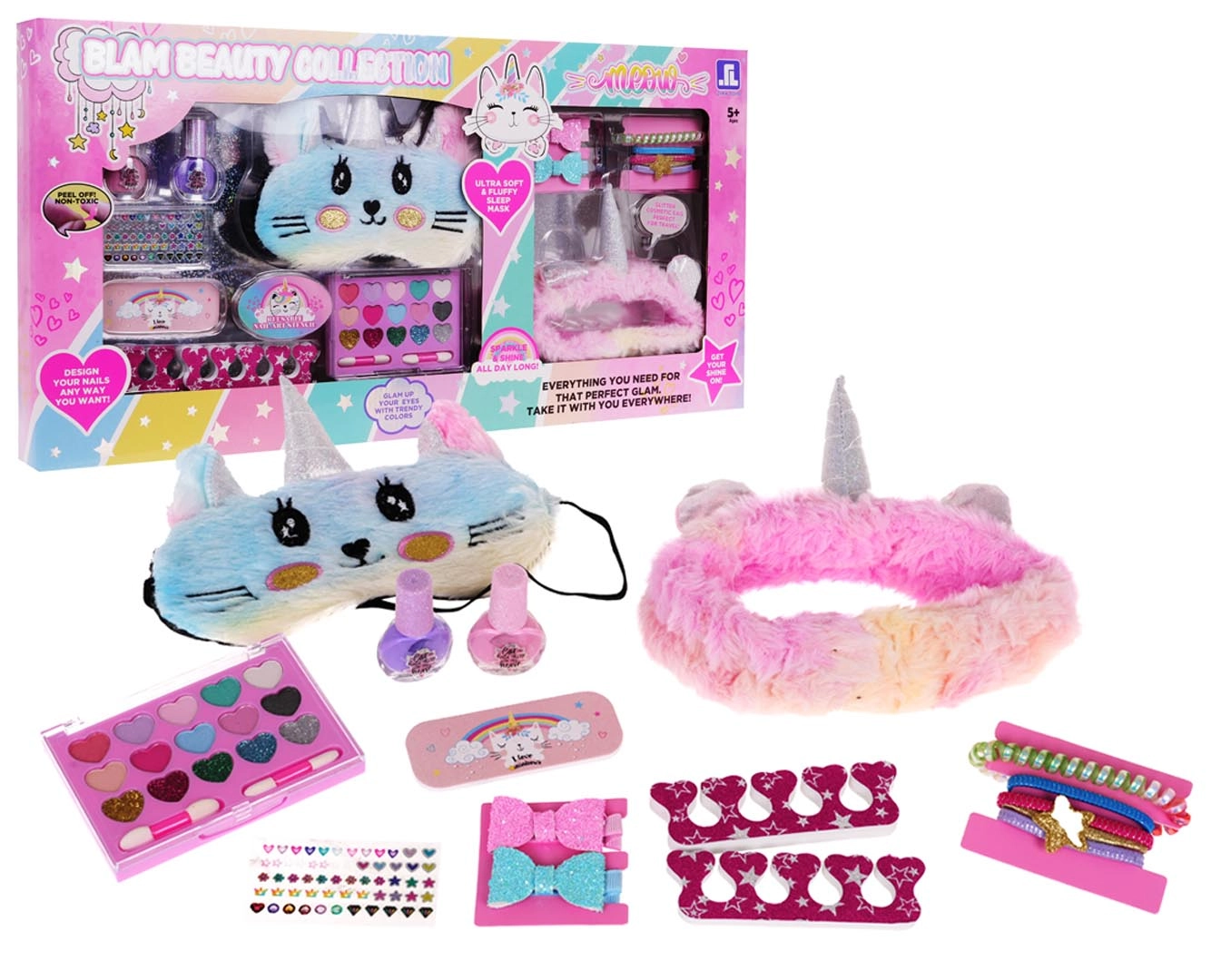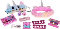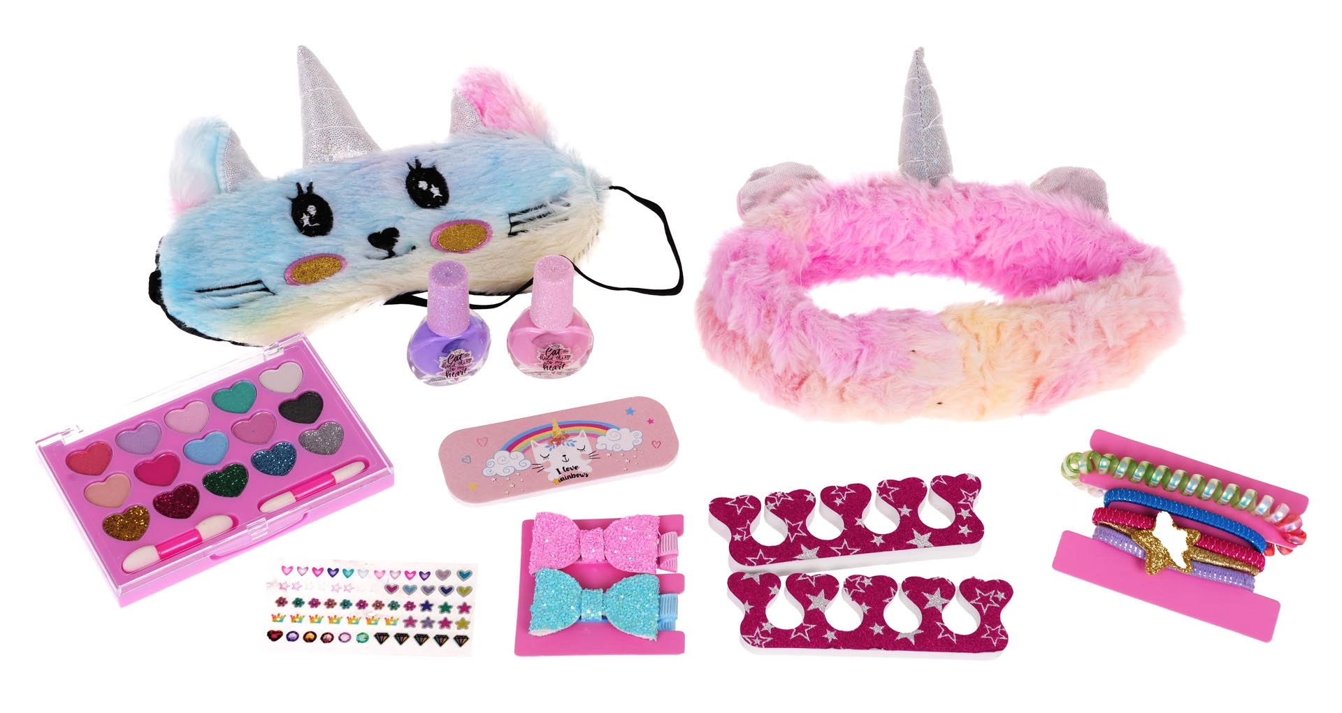 Incluye una paleta con 15 sombras de ojos, esmaltes de uñas infantiles, brochitas, gomas, horquillas y espiral para el cabello, además de una diadema de unicornio y antifaz para dormir. Este divertido set de cosmética estimula la creatividad, desarrolla la motricidad fina y fortalece el buen gusto y sentido del color.