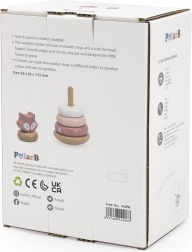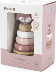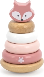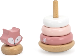 Este juguete apilable de madera ofrece 6 piezas en suaves colores pastel, incluida la pieza superior con la cabecita de zorro. Los niños colocan los aros en el poste central según el tamaño, el color o su imaginación, ejercitando así el pensamiento lógico, la paciencia y la percepción espacial.