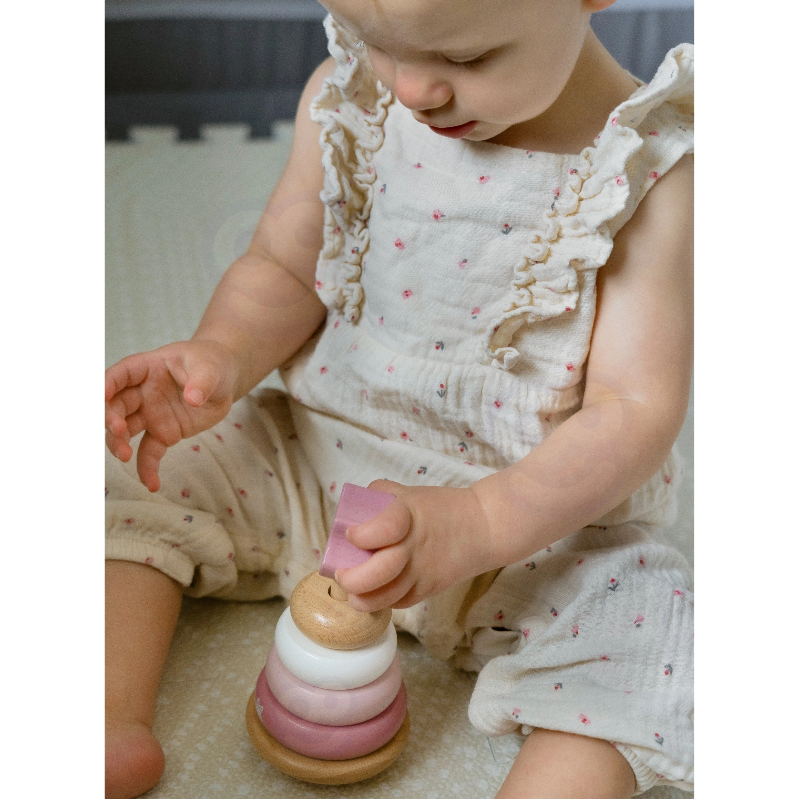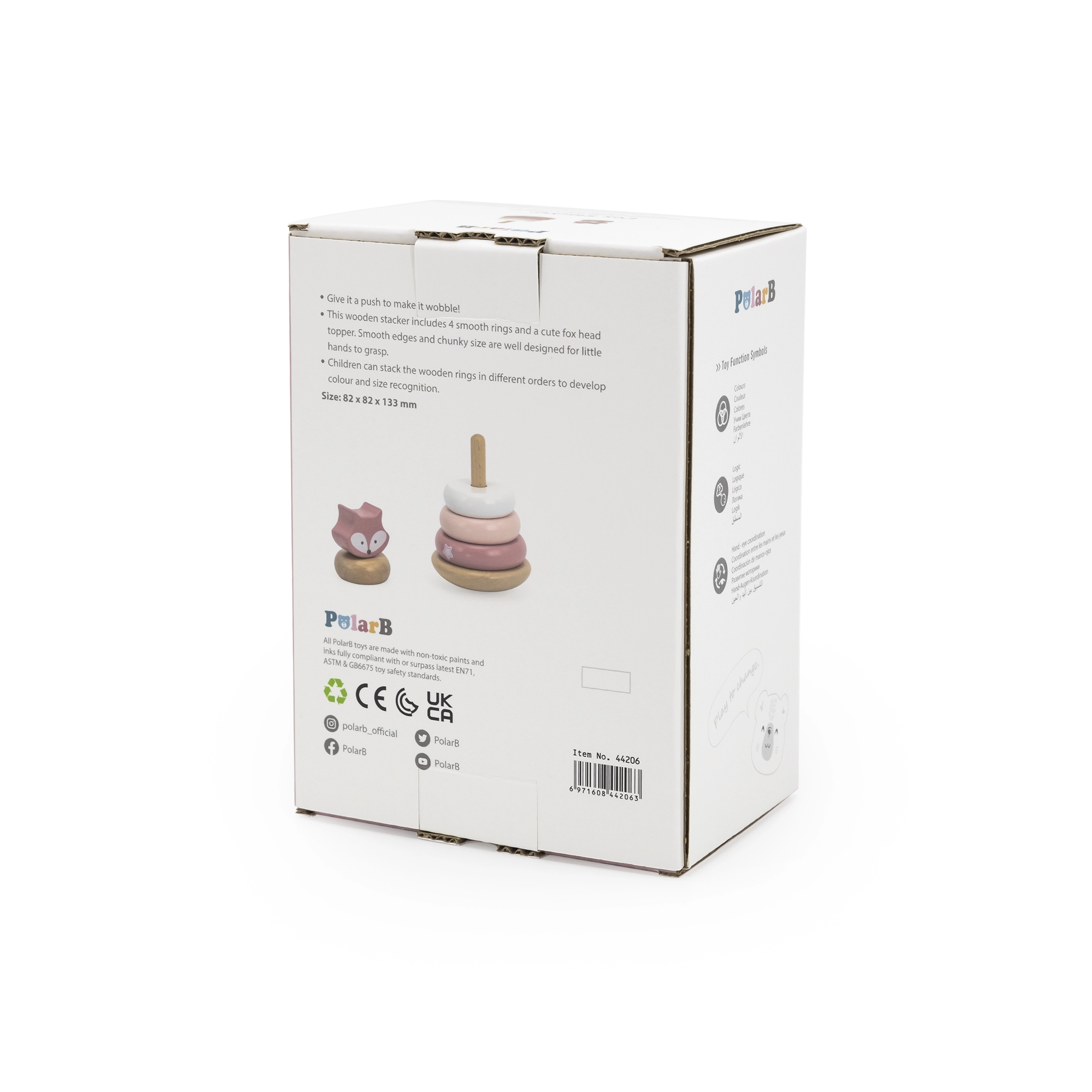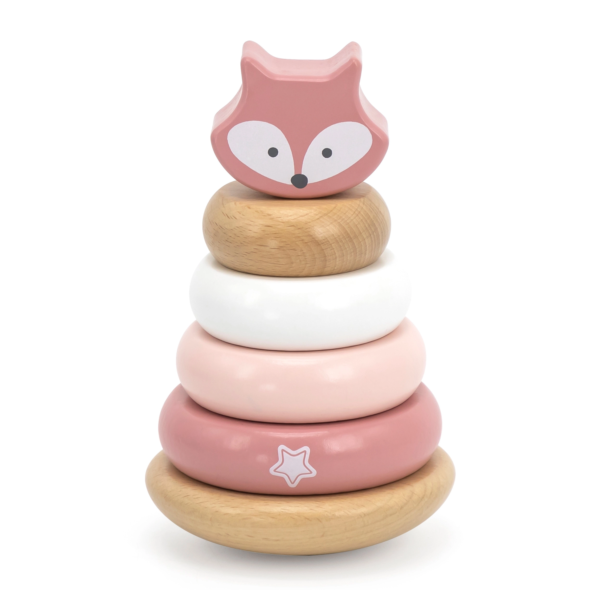 Los atractivos tonos pastel y la pieza superior con el zorro motivan a los niños a apilar y aprender colores y tamaños.