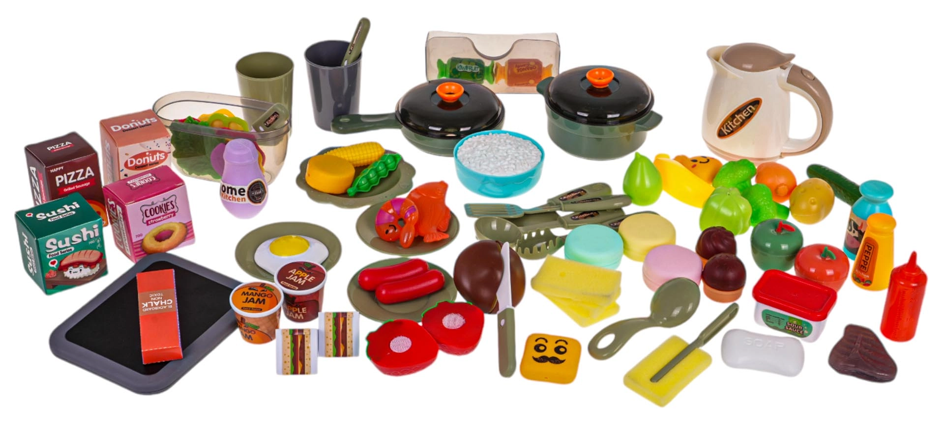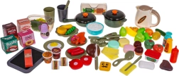 Olla, sartén, cubiertos, platitos, alimentos con velcro, bebidas, especias, pizarra de tiza y pegatinas: todo para una cocina creativa.