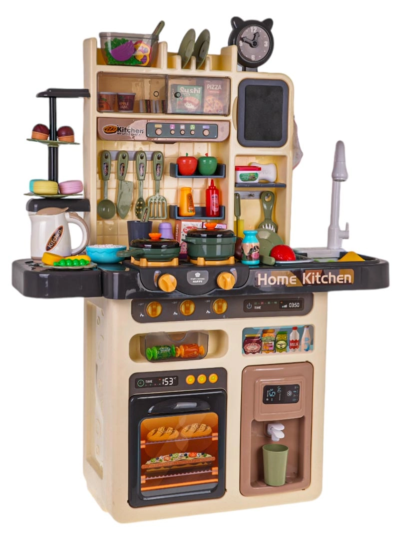 Incluye también una pizarra de tiza extraíble para el menú del día, estantes y armarios para un almacenamiento ordenado y un reloj con manecillas móviles para aprender la hora. El completo set de accesorios (vajilla, cubiertos, alimentos y pegatinas) favorece el desarrollo de la imaginación, la motricidad fina y el juego en grupo.