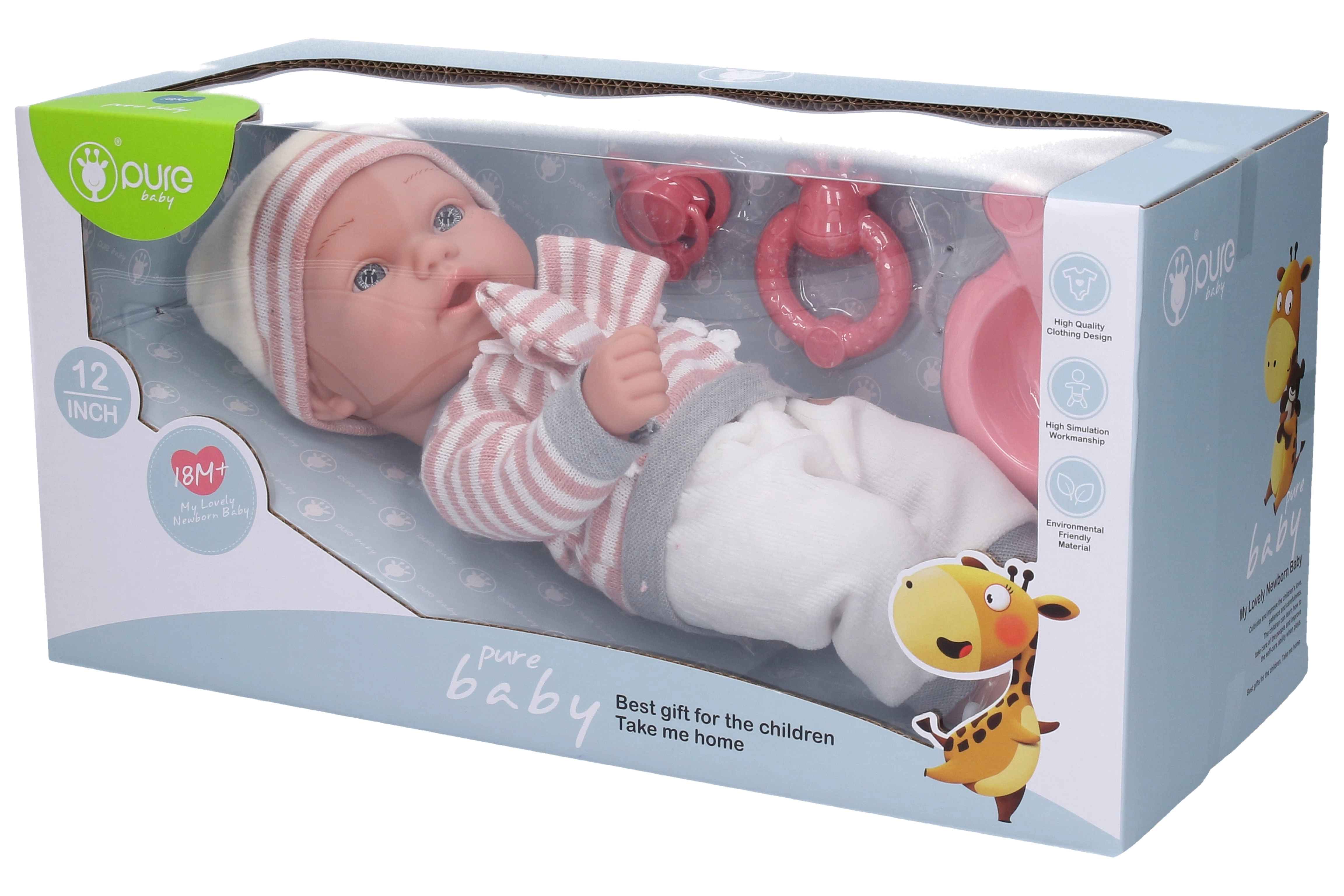 Este adorable bebé de 30 cm es ideal para cualquier niño que ame jugar con muñecos realistas. Con este set, puedes esperar horas de diversión llenas de cuidado e imaginación gracias a los accesorios incluidos como el chupete, el sonajero y el cuenco con cubiertos.
