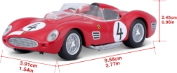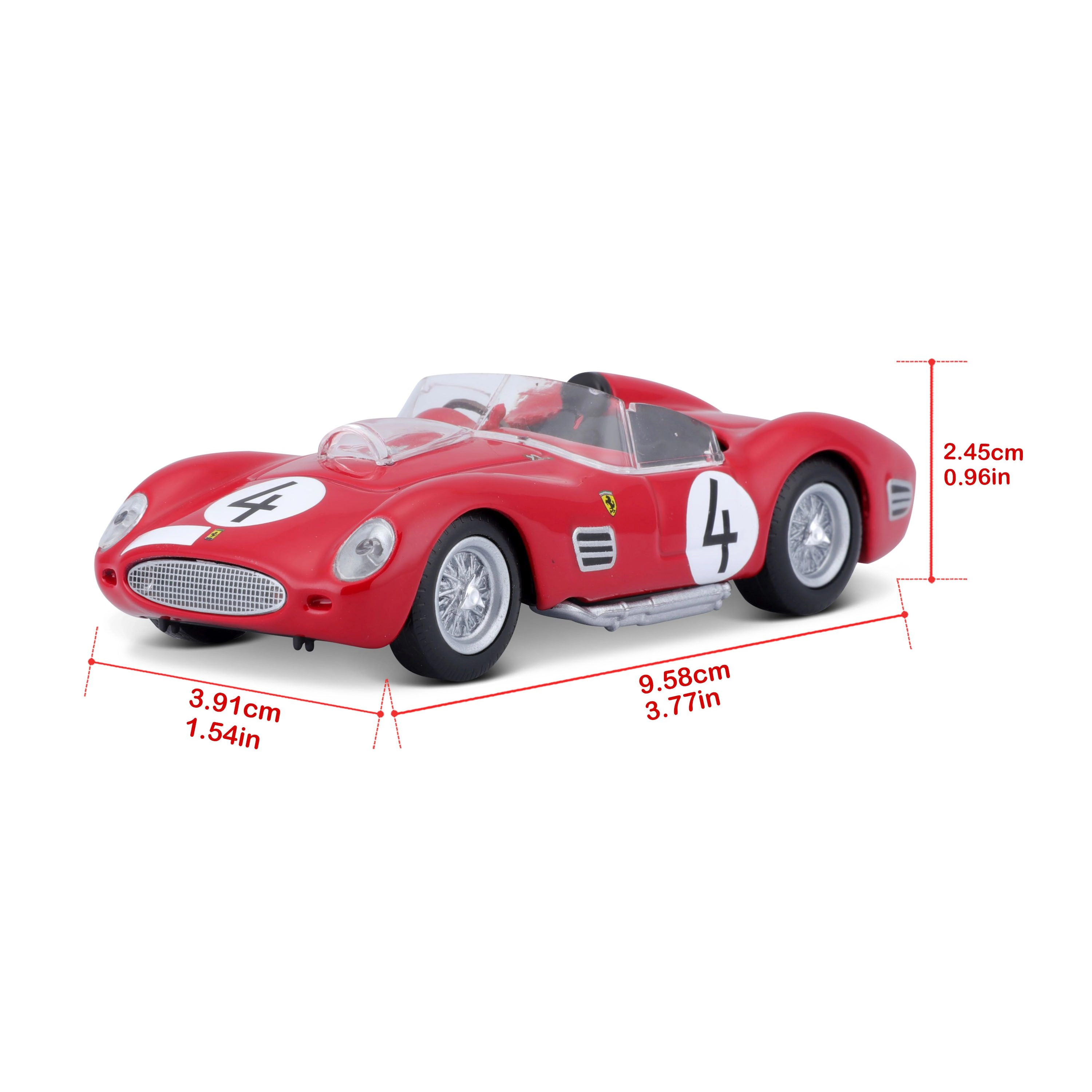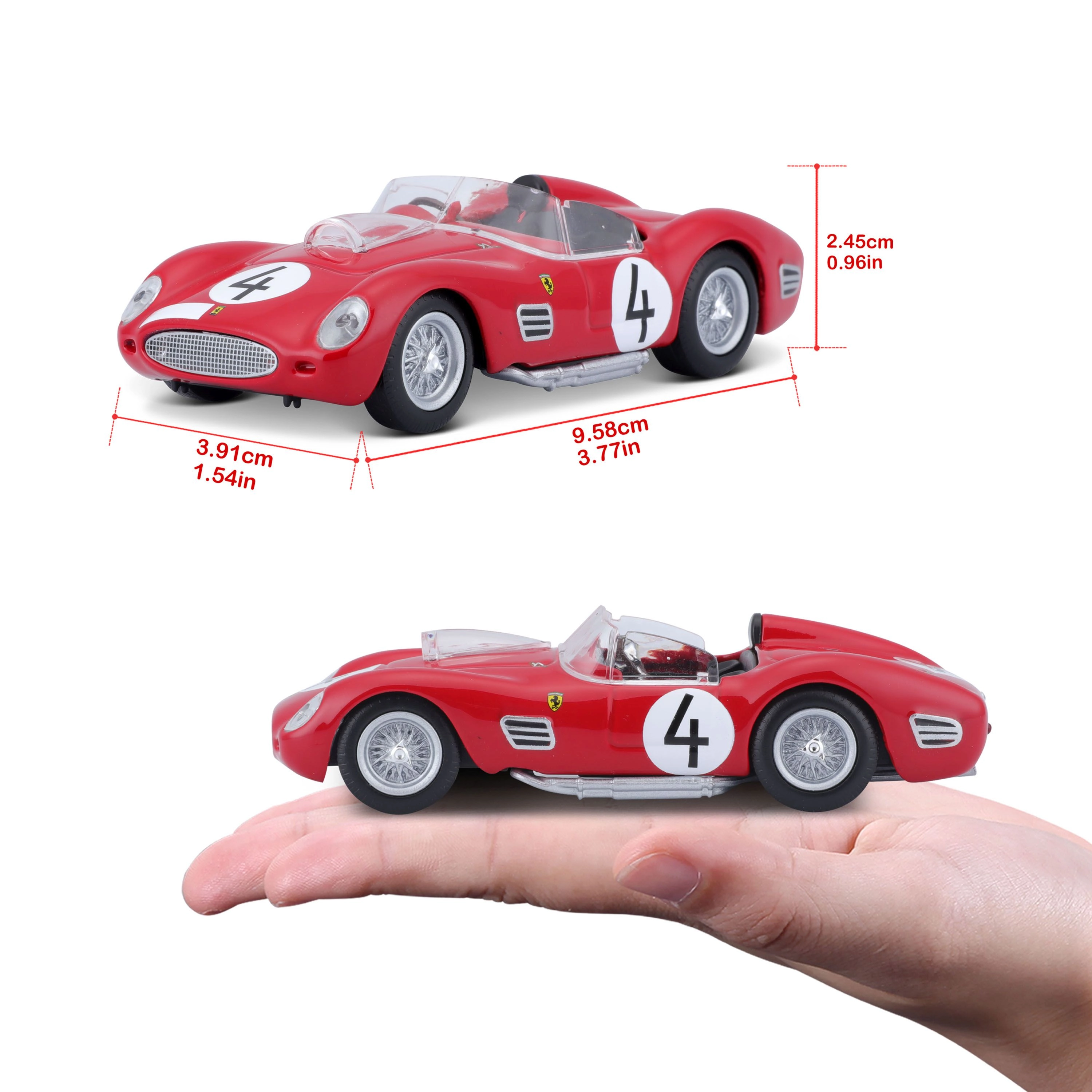 El modelo está fabricado en metal die-cast con piezas de plástico para los detalles finos. Gracias a su carrocería fiel, interior detallado y el rodamiento suave de las ruedas, luce genial y se desplaza bien sobre superficies lisas. Incluye caja original Ferrari Racing para guardarlo y exhibirlo con seguridad.